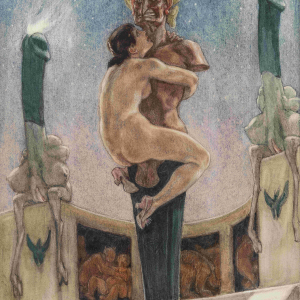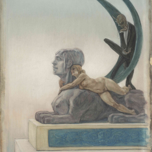 Entre 1878 et 1882, Félicien Rops (1833-1898) travaille avec passion sur des dessins, qui comptent aujourd'hui parmi ses chefs-d'œuvre, dont la célèbre "Pornocratès" (1878), exposée au sein de la collection permanente, différents projets figurant dans l'exposition. A son sujet, il écrit, en 1879, à l'écrivain belge Edmond Picard (1836-1924) : "Voici : sur une frise antique, une grande femme, nue comme toutes les vérités, les yeux bandés, gantée de noir, chaussée de grands bas de soie, coiffée d'un Gainsborough, se laisse guider par un cochon, à queue d'or."
