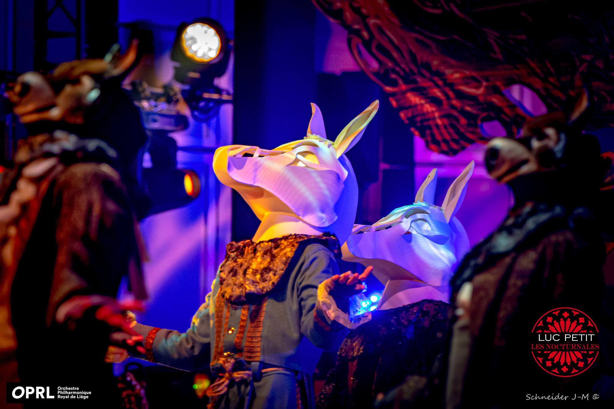 Quelques 130 costumes, certains dignes du célèbre Carnaval de Venise, sont portés par nombre de comédiens, accompagnés par dix musiciens de l’ « OPRL », Luc Petit ayant déclaré les concernant : « L’idéal dans un tel spectacle serait d’avoir une adéquation parfaite entre musiciens, acteurs et danseurs. Je suis ravi de faire participer les musiciens qui acceptent de s’amuser et de se mettre en scène. Je ne peux pas ne voir en eux que des instrumentistes assis sur une chaise … »