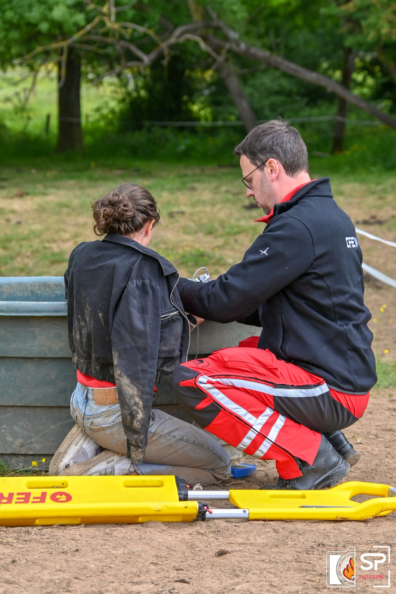 Antoine met en route et le reste de l'équipe arrive, direction la zone de secours hemeco pour un coup de sabot d'un cheval sur une jeune femme dans une prairie.