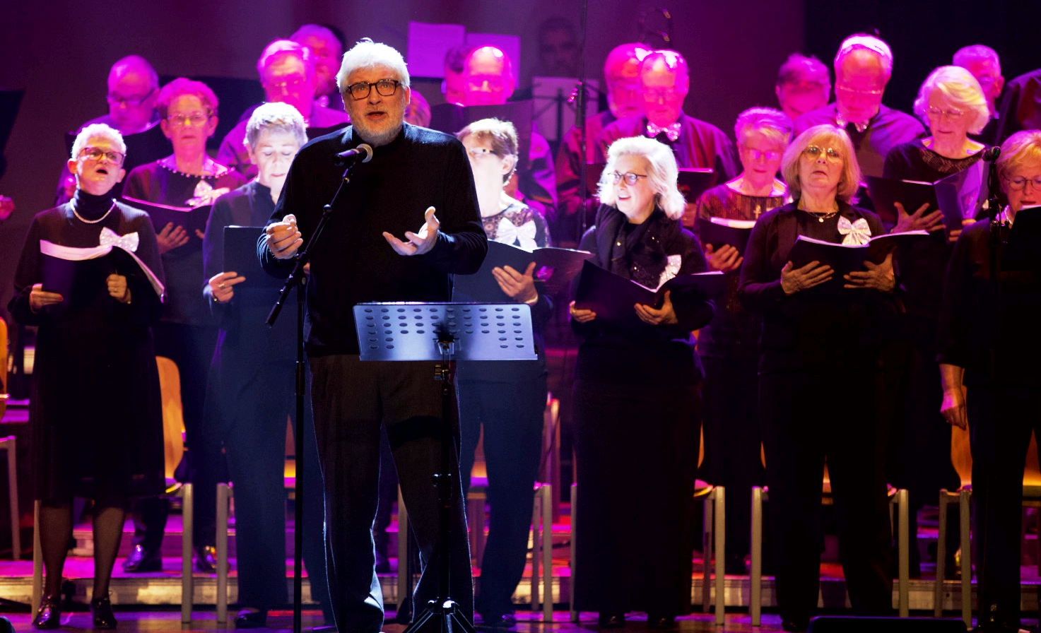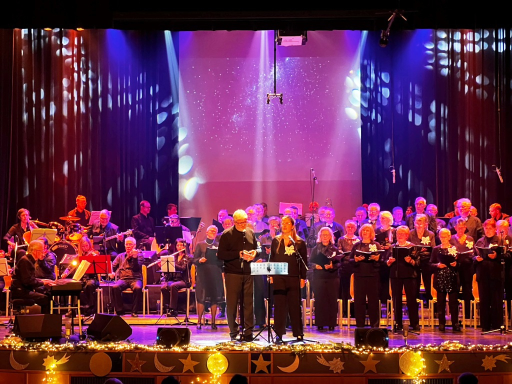 Emmené par un couple d’extraterrestres plus vrais que nature, dans leur soucoupe volante intersidérale, ainsi que par une impressionnante chorale de 30 chanteurs et chanteuses conduits par un orchestre à chordes, sous la direction générale de Jacky Lodomez et sur le thème de l’espace, le spectacle a proposé une pléiade de chants de Noël, tous spécialement réécrits pour l’occasion en wallon de Malmedy par des membres du club. Un régal pour tous les amateurs de notre bonne vieille langue ancestrale ! Un groupe de cuivres dirigés par Jacques Arimont complétait le plateau.