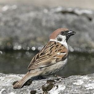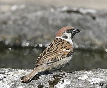 Friquet ou domestique? Les moineaux friquet ( Passer montanus ) et domestique ( Passer domesticus ) sont difficiles à distinguer, Le moineau friquet est un peu plus petit que le moineau domestique. Le friquet se caractérise par la tâche noire sur les joues blanches et par son collier blanc qui fait presque le tour du cou. La tête, la nuque et le croupion sont marron.