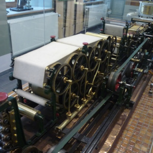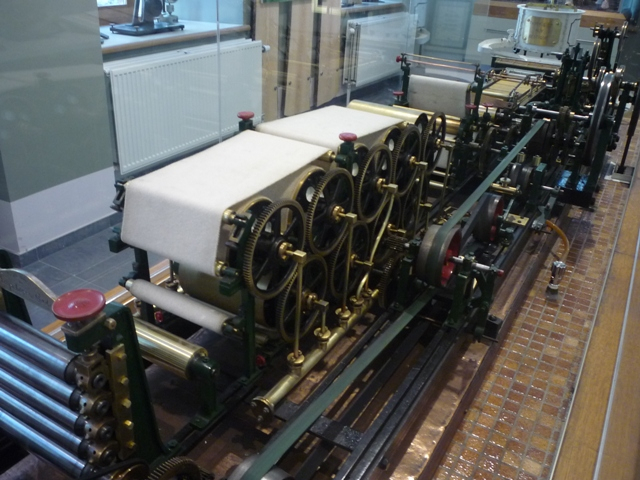 Si les différents supports d’écriture sont détaillés et l’histoire des techniques de fabrication expliquée, l’atelier du papier exhibe trois pièces maîtresses : une reproduction miniature d’un moulin à papier du XVIIIe siècle, la reproduction de la première machine en continu inventée par Nicolas Robert en 1799 et le joyau de l’atelier : la reproduction miniature de la machine en continu Thiry datant du premier quart du XIXe siècle.