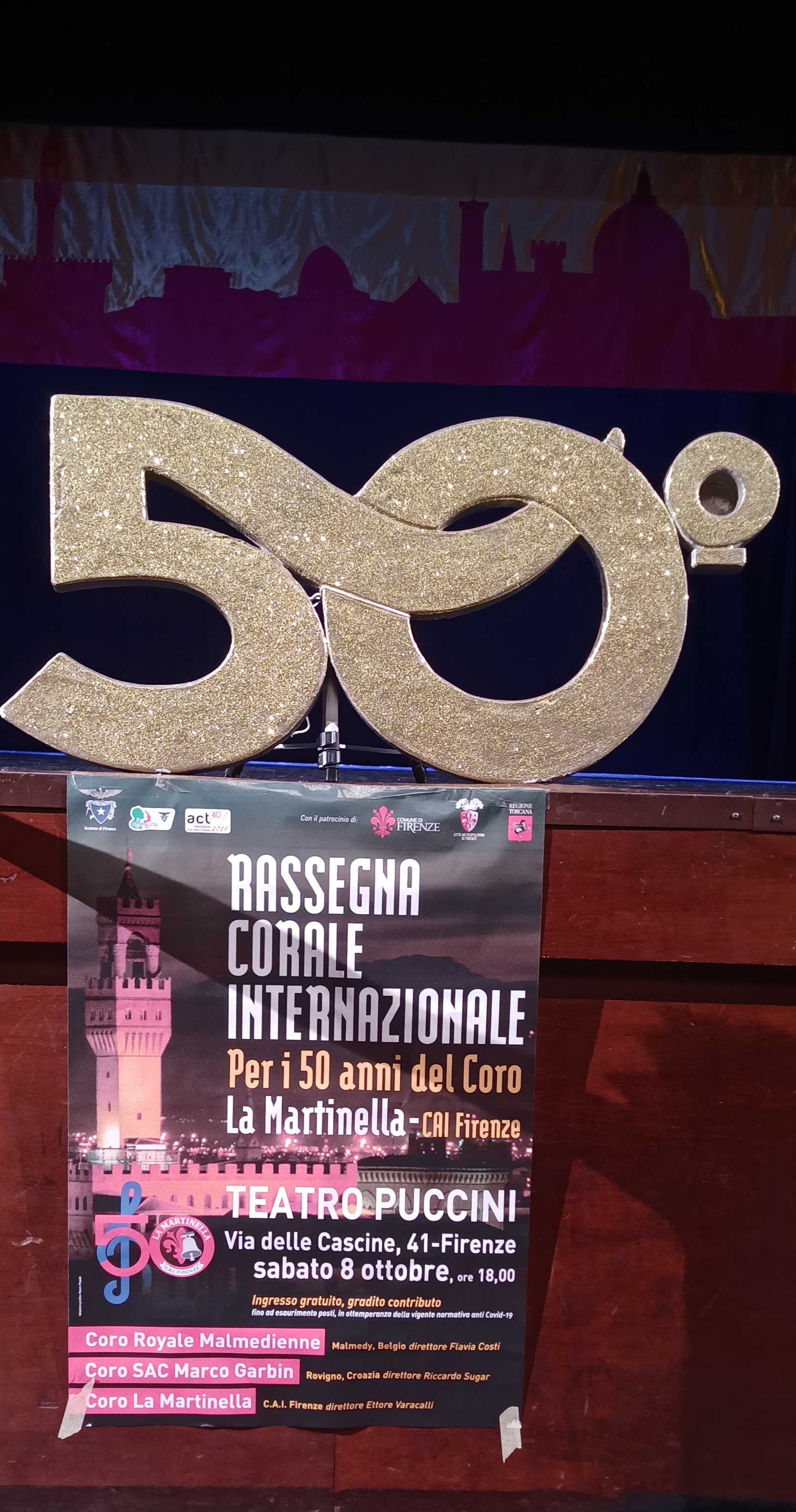 Vint ensuite le point d’orgue artistique du déplacement : le concert donné dans les antres du théâtre « Puccini » sous la baguette de Flavia Costi, remarquablement accompagnée par le piano de Damien Gits. La Malmédienne offrit au nombreux public un échantillon de son répertoire, en passant du folklore malmédien à l’opéra, la variété et la comédie musicale. Et pour un succès, ce fut un triomphe pour la Directrice et ses chanteurs, puisqu’un tonnerre d’applaudissements concluait cette soirée qui vit également se produire le Coro « La Martinella » ( qui, ce soir-là, clôturait le programme des festivités marquant son 50ème anniversaire ) et le chœur croate de Rovigno. C’est d’ailleurs par l’interprétation du très émouvant « Signore del Cime » par tous les choristes réunis et placés sous la baguette de Flavia Costi que se refermait ce premier tableau inoubliable de la journée. Cette prestation d’ensemble était pour l’occasion dédiée à un membre de la chorale croate resté au pays et malheureusement décédé le jour même, preuve s’il en est que le chant est vecteur d’amitié.