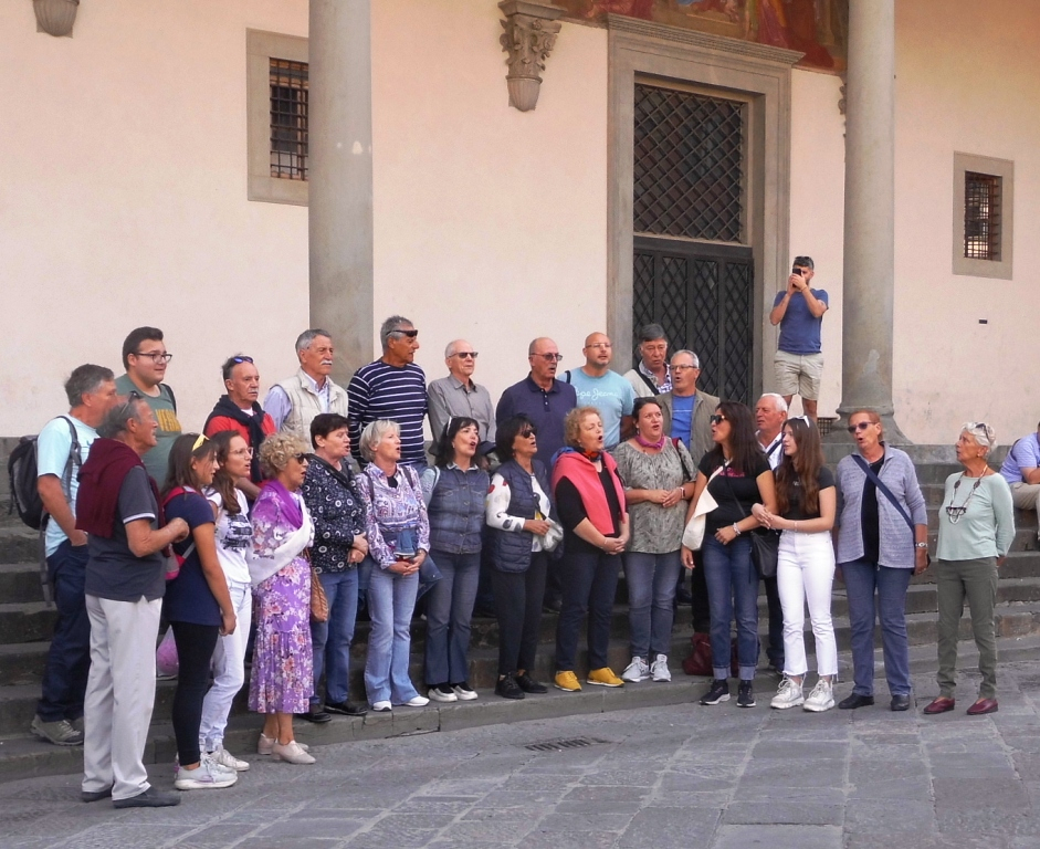 Le jeudi 6 octobre en soirée, 104 personnes prenaient la route de l’Italie pour un long voyage qui ne vit son terme que le lendemain à 13 heures. Fourbus mais bien décidés à passer de bons moments ensemble, tous prirent d’emblée la direction du « Castel del Trebbio », sis à une trentaine de kms de la capitale toscane. Grand soleil, température de rêve, visite des caves,… et dégustation des produits du domaine eurent tôt fait de stimuler les plus calmes des participants qui allaient offrir une première prestation dans la cour du château autrefois fréquenté par les Médicis. Ce n’était qu’un début, mais tous et toutes comprirent que « quelque chose » allait se produire. En début de soirée, une première incursion dans le centre historique de Florence amenait la troupe dans un restaurant local pour un premier repas. Très vite, les choses prirent un tournant musical déjà inoubliable avec l’interprétation en pleine luit florentine devant le Palazzo Vecchio et le célèbre David de Michelange, de notre « Nut du May ». Nous y étions et, comme dirait l’(autre, nous allions y rester un bon moment puisque, dès le lendemain, une visite plus globale du centre historique se concluait par un concert en plein air sur la très belle place de la « Santissima Anninziata ». A cette occasion, les Malmédiens rencontraient pour la première la chorale croate « Garmin » en provenance de la superbe ville côtière de Rovinj ou Rovigno. Une joute très amicale vit chacune des chorales se répondre l’une l’autre par un chant de circonstance. Mais les estomacs criaient famine et le repas de midi, fait de charcuteries, fromages et autres mets typiques, fut apprécié de tous.