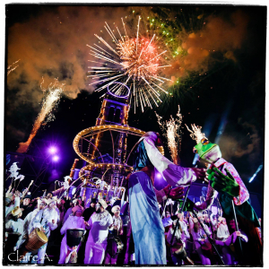 Mais, devant la façade du Château de Beloeil, présent depuis huit siècles, nous voici, le 21 décembre 1872, à la 10è et ultime étape, de retour au « Reform Club », à Londres, avec une dernière danse, célébrant la réussite du pari de Phileas Fogg, qui, assisté de Jean Passepartout, vient de réussir son « Tour du Monde en 80 Jours » – en terres inconnues, au cœur des déserts brûlants et de la jungle profonde, sur les cimes vertigineuses des montagnes rocheuses ou dans l’infini des océans -, un feu d’artifice clôturant ce parcours de plus de deux heures, égayé d’acrobaties vertigineuses, des jeux de lumières et de fumées, d’effets pyrotechniques impressionnants, avec la participation, notamment, des montgolfières de l’asbl « BBC » (« Belgian Balloon Club ») et des jongleurs de feu de l’asbl « Ca sent le roussi ».