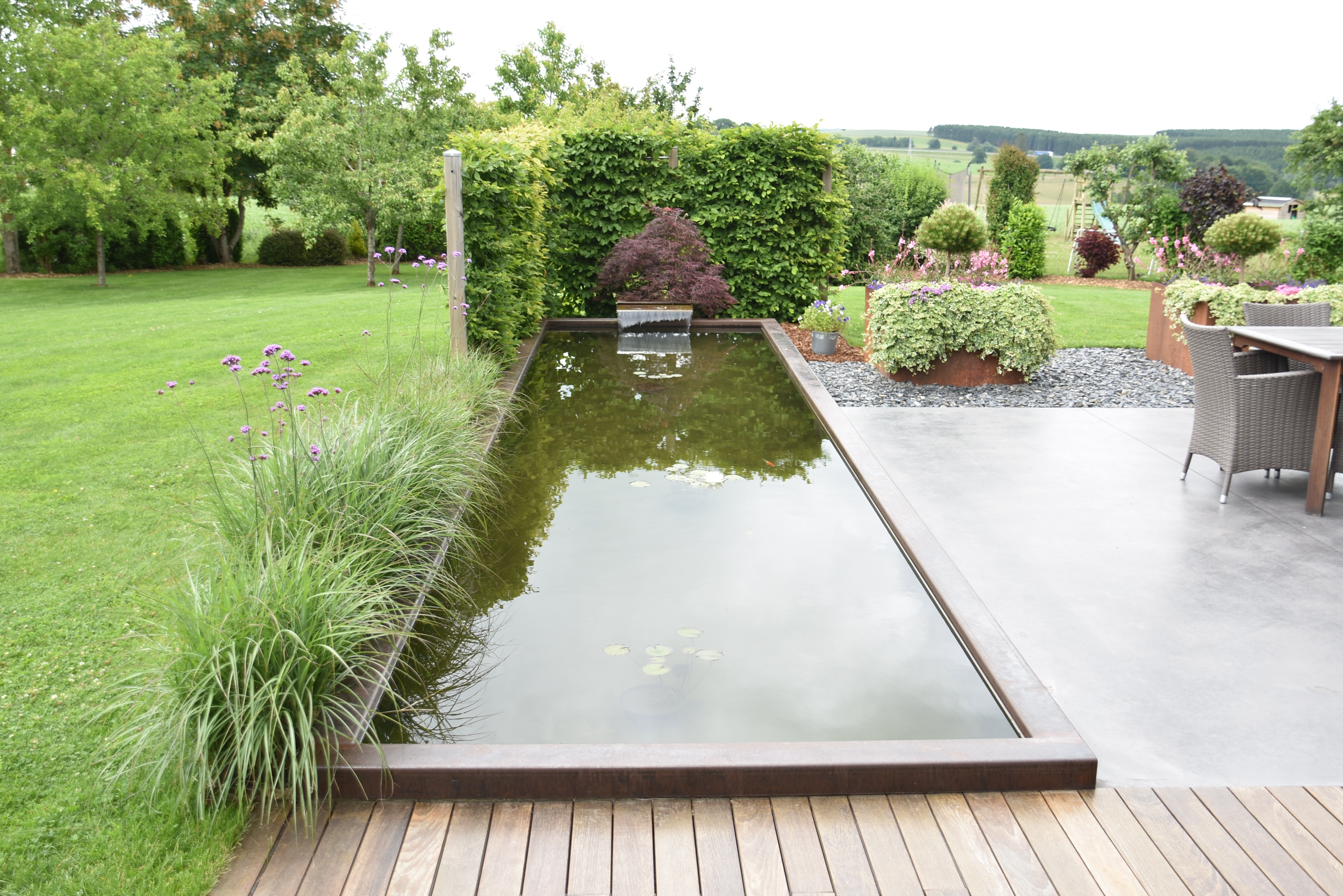 avec un environnement minéral, floral et aquatique autour d'une terrasse.