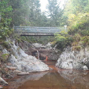 La Venntrilogie nous réserve encore bien des surprises. Au cours de la quatrième étape, j'ai admiré une cascade très particulière. On l'entendait et on la voyait déjà depuis le chemin, mais pour l'atteindre, il faut encore faire une courte descente très raide sur des rochers. L'eau tombe de très haut. Je me suis sentie conviée à m'attarder ici et j'ai presque perdu la notion du temps.
