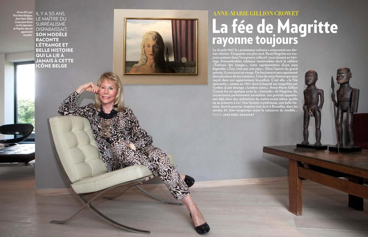 Comme Lisa Giocondo fut la modèle de Léonard de Vinci (Leonardo di ser Piero da Vinci/1452-1519), c’est une Bruxelloise, la fille du Baron Pierre Crowet, ami, depuis les années ’20, de René Magritte, Anne-Marie Gillion Crowet, qui devint « La Fée ignorante », dont la beauté est magnifiée par l’ombre d’une étrange « lumière noire », qui fut la muse du peintre. En 2017, à notre collègue Michel Boufioux, pour « Paris-Match », elle confia : « (Ce fut) une rencontre surréaliste ? Oui, c’est le terme ! Quand je suis arrivée, j’étais troublée, j’avais la frousse. Comment devais-je me comporter ? Il m’a dit très simplement de m’assoir sur un tabouret qui se trouvait au milieu de son salon … A ma droite, mon regard fut littéralement capté par le cheval d’une toile, dont les yeux et les cheveux étaient ceux d’une femme. J’étais fascinée, comme envoûtée. Il s’est mis à rire et il m’a dit : ‘Tu vois, je te peignais déjà avant de te connaître’. De fait, le regard de cet étrange animal aurait pu être le mien … C’était le mien ! En réalité, mon visage semble déjà se retrouver dans des œuvres antérieures à notre rencontre, comme si j’étais la femme qu’il avait toujours peinte.«