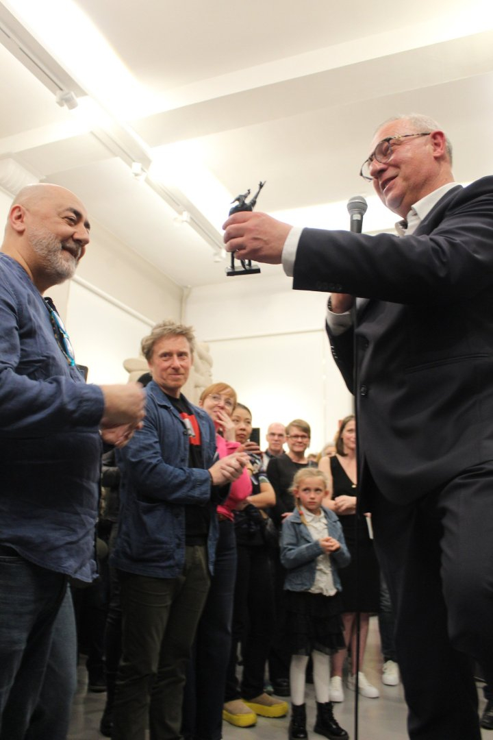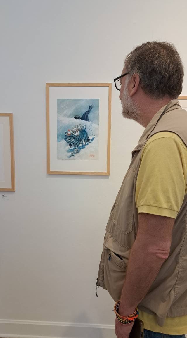 Ainsi, les premières salles nous présentent ces oeuvres, des plus originales, réalisées spécialement pour cette exposition, par amitié pour Miguel Diaz Vizoso, certaines, arrivées au musée en toute dernière minute, ne figurant pas au sein du livret-catalogue et ne possédant pas encore leur cartel à quelques heures du vernissage, comme celle peinte par Dan Verlinden (°Marcinelle/1972), représentant, marchant dans la neige, une louve, animal symbolique de La Louvière, portant une quinzaine de « Schtroumpfs », grelotant de froid, le bras tendu de la statue « L’Appel », couchée sur le sol, ressortant de la neige, derrière la louve.