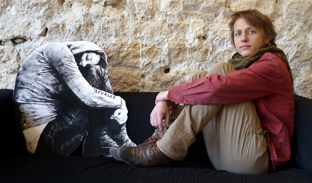 Nicolas Martin, le Bourgmestre, nous exprima sa satisfaction d’y voir la façade gothique de l’Hôtel de Ville si parfaitement reproduite par« Jana et JS », Jean-Sébastien nous précisant : « L’architecture est très présente dans notre travail mais c’est l’humain qui reste notre thème principal »… Et évoquant l’humain, signalons que, comme dans la plupart de leurs oeuvres, ce sont leurs portaits que nous retrouvons – réalisés au pochoir, avec une grande maîtrise technique – sur ces deux fenêtres du magasin « Petits Pois ». Concernant les fenêtres, il poursuit : « Elles constituent un élément essentiel de notre travail, ouverture sur le monde ou ouverture sur un monde imaginaire, onirique, intime ou les deux à la fois ? C’est cette double ouverture que nous mettons en scène ici. Dans un jeu surréaliste où l’on voit l’extérieur et l’intérieur à la fois, ces deux fenêtres nous projettent dans la Ville et dans l’intimité des deux personnages. »