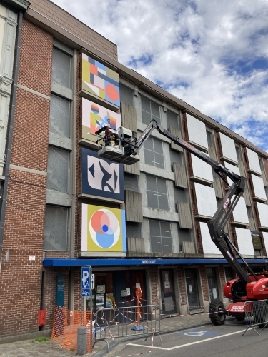 Passant devant l’Hôtel de Ville, pouvant, au passage, pour nous porter bonheur (qui sait ?), caresser la tête du célèbre petit singe en fer forgé, nous tournons à gauche, à l’angle du « Théâtre Royal ». Décorant la façade du « BAM » (« Musée de Beaux-Artsde Mons »), nous découvrons une autre installation, présentant des panneaux réalisés par différents artistes.