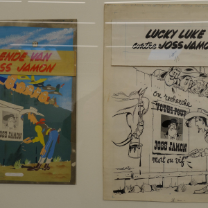 Cent planches originales sont à découvrir, disposées suivant l’ordre chronologique de leur création, Claude de Saint-Vincent (*Neuilly-sur-Seine/1952), directeur général de « Média Participations » – qui regroupe, entre autres, « Dargaud », « Dupuis » et « Le Lombard » – écrivant, en préface du catalogue de l’exposition : “Rêvant d’animation, passionné de cinéma, ‘Morris’ adopte l’archétype hollywoodien de l’époque, choisit un cow-boy comme héros et s’empare de l’univers du western.“