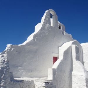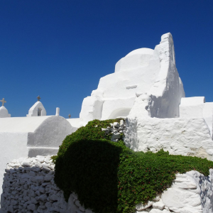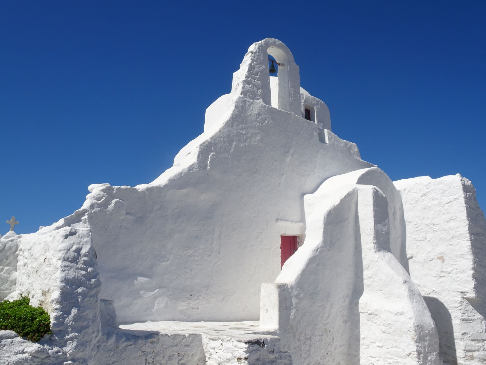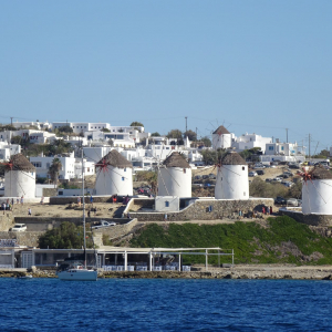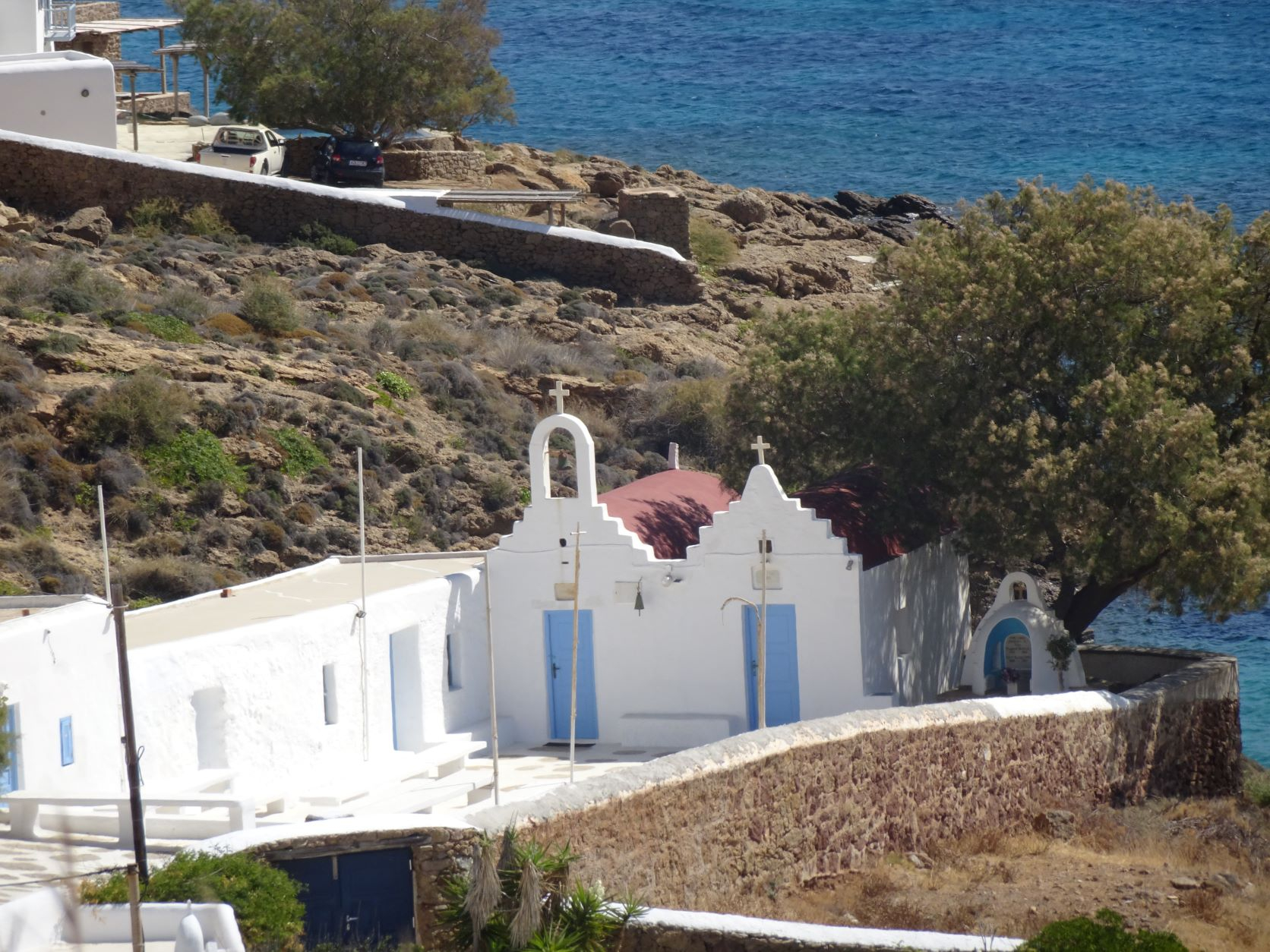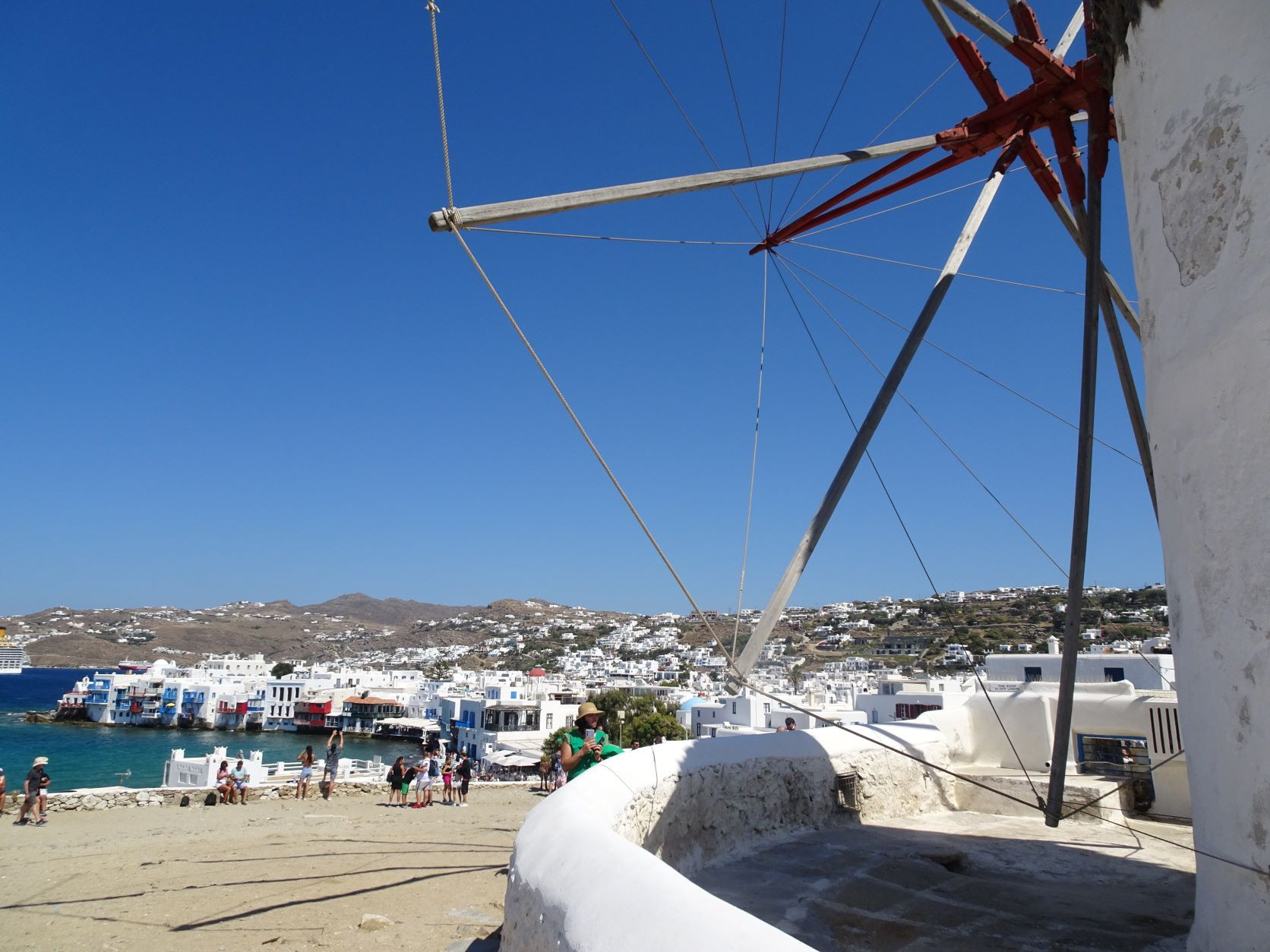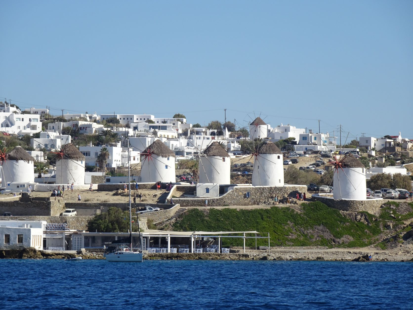 Six moulins dressent leurs ailes tronquées dans le ciel, rendu extraordinairement pur, par le vent de l’été, le meltem. Tout semble avoir été ordonné par un publicitaire de talent. Mykonos compte 365 chapelles et Paraportiani est le monument le plus photographié de l’île. Il s’agit d’un ensemble de quatre petites églises au niveau du sol et une à l’étage, qui est connue comme Paraportiani (parce qu’elle se trouve près de la petite porte –en grec, paraporti). Il parait que le groupe fut construit progressivement au XVIe et XVIIe siècles. Des fouilles sont effectuées près de Paraportiani ; il s'agit de restes d'un château médiéval.