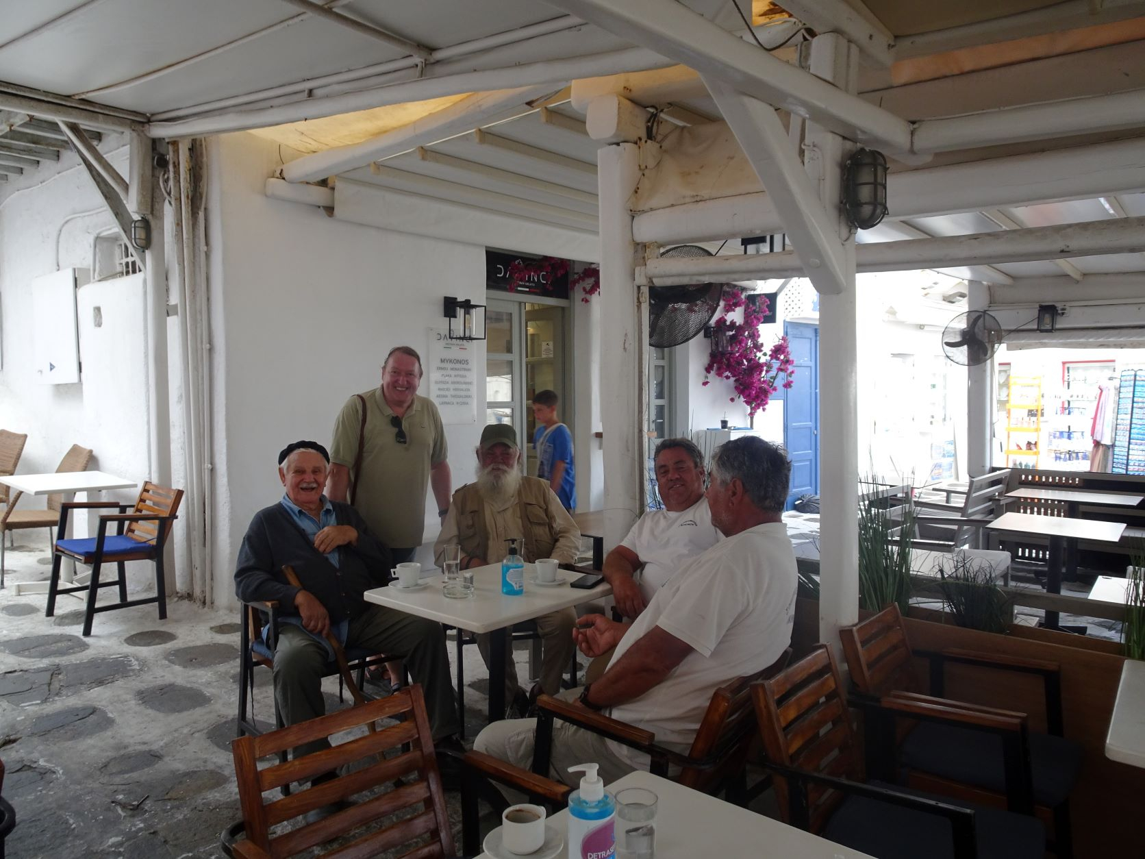 La table est présente aussi à Mykonos. La taverne Bakoyias Yialos chez Vassiliki (fille et grand-mère) et Mina (maman), dans le port, présente la bonne cuisine grecque traditionnelle. Au menu, l’on peut conseiller notamment les calamars frits, les keftedes (boulettes de viande hachée préparées avec du pain, des oignons et sans aïl), les soutzoukakia (autre sorte de boulette de viande hachée, sans pain mais avec de l'aïl et servie avec de la sauce tomate, comme les keftedes), la moussaka (plat grec par excellence avec aubergine, viande hachée et sauce béchamel), les souvlakis (brochettes de porc ou de poulet) et autres spécialités maison comme le bekri meze à 9€ (porc mijoté au vin rouge avec oignons et tomates) un régal ! Voilà l'endroit idéal et moins cher pour déguster une bonne bière pression Mythos (50 cl à 5€) ou un petit café grec. Yialos reste le lieu rêvé pour rencontrer les vrais Mykoniates comme Dimitris, Yianis, Gerasimos, Kostas ou Georgios et peut-être aussi le jeune et sympathique maire Konstantinos Koukas.