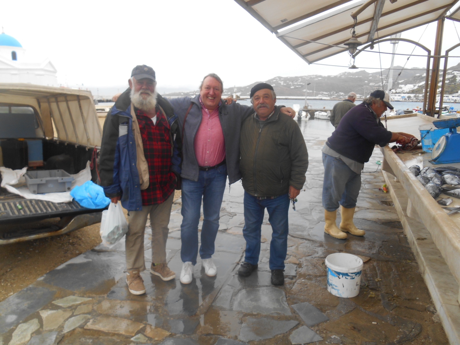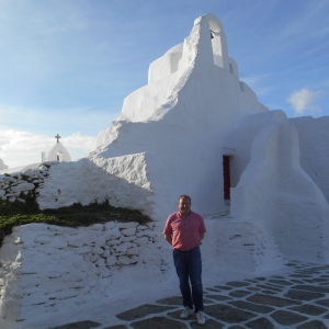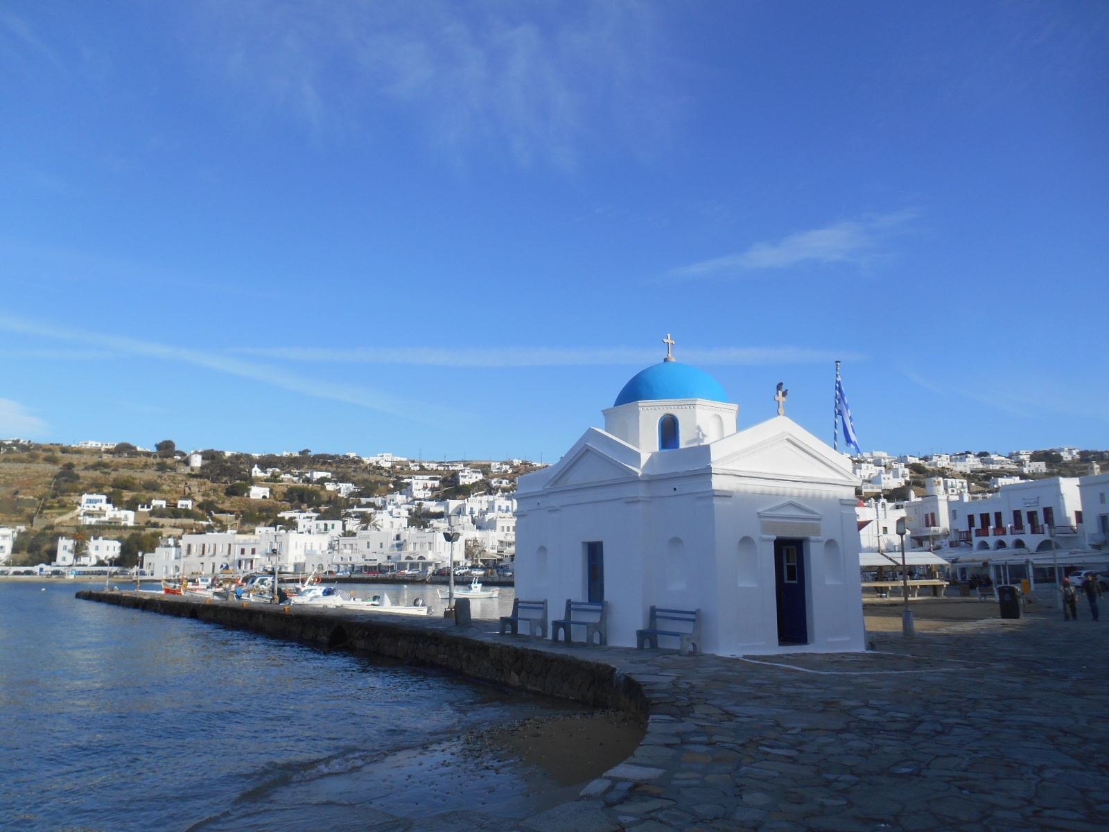Alefkandra est le quartier aimé des artistes, qui s’en inspirent souvent pour leurs tableaux. En novembre, le ciel est très lumineux et l’île respire la tranquillité. Le calme apporte une sensation bienfaisante, les Grecs discutent volontiers avec la dizaine de touristes présents dans le port. Pétros, le pélican vedette et mascotte de Mykonos, se laisse un peu caresser, dans une des nombreuses ruelles de Chora. A chaque passage dans le port, l’on reconnaît quelques pêcheurs, tels que Yianis et Panayis. Avec une voiture de location SunnyCars, il est possible de découvrir des coins peu fréquentés de l’île et de superbes plages désertes, telles Super Paradise, Ornos, Plati Yialos, Agios Stefanos, Agri Beach, Elia, Kalo Livadi et Kalafati. Ma plage préférée est Agios Sostis, dans le nord, avec une merveilleuse petite chapelle blanche. Quelle vue superbe sur l'Egée. Ano Mera mérite une visite pour son monastère Panagia Tourliani et le pope bien sympathique Alexios Papadopoulos se laisse photographier. La table est présente aussi à Mykonos, même en novembre, notamment chez Maria, près de l’Hôtel Leto, établissement très correct, sympathique et présentant la bonne cuisine grecque traditionnelle, Au menu, l’on peut conseiller notamment les keftedes, les lakano dolmades (chou et courgette farcis de riz et viande hâchée, car pas de feuilles de vigne en hiver), les soutzoukakia (autre sorte de boulette de viande hachée, sans pain mais avec de l'aïl et servie avec de la sauce tomate, comme les keftedes), la moussaka (plat grec par excellence avec aubergine, viande hachée et sauce béchamel), l'agneau au four et le baklava (succulent dessert à base de miel). Au café et snack Yialos, chez Vassiliki (fille et grand-mère) et Mina (maman), ouvert à cette période de l’année, les autochtones nous font signe ; c’est tout à fait différent de l’été et de la haute saison touristique. Voilà l'endroit idéal et moins cher pour déguster une bonne bière Mythos, un petit café grec ou encore déguster les calamares frits, les keftedes (boulettes de viande hachée préparées avec du pain, des oignons et sans aïl), les souvlakis (brochettes de porc ou de poulet) et autres spécialités maison. Yialos reste le lieu rêvé pour rencontrer les vrais Mykoniates et peut-être aussi le jeune et sympathique maire Konstantinos Koukas. Pour les amateurs de cocktails et raffinement, rendez-vous chez Alegro. Au pied des moulins, vous pouvez acheter de l'artisanat authentique grec chez Mitho. L'Hôtel Mykonos Beach***situé à Megali Amos, à quelque 5 minutes en voiture des moulins et à 7 minutes du port de Mykonos, est à conseiller pour ses petits maisons blanches, son accueil agréable avec Eva et Alex et la vue sur la mer Egée. Un moment bien agréable après les visites. Goûtez les calamares avec tzatziki et la retsina Malamatina. Kali orexi, bon appétit. Kalo taxidi stin Mykonos. Bon voyage à Mykonos.