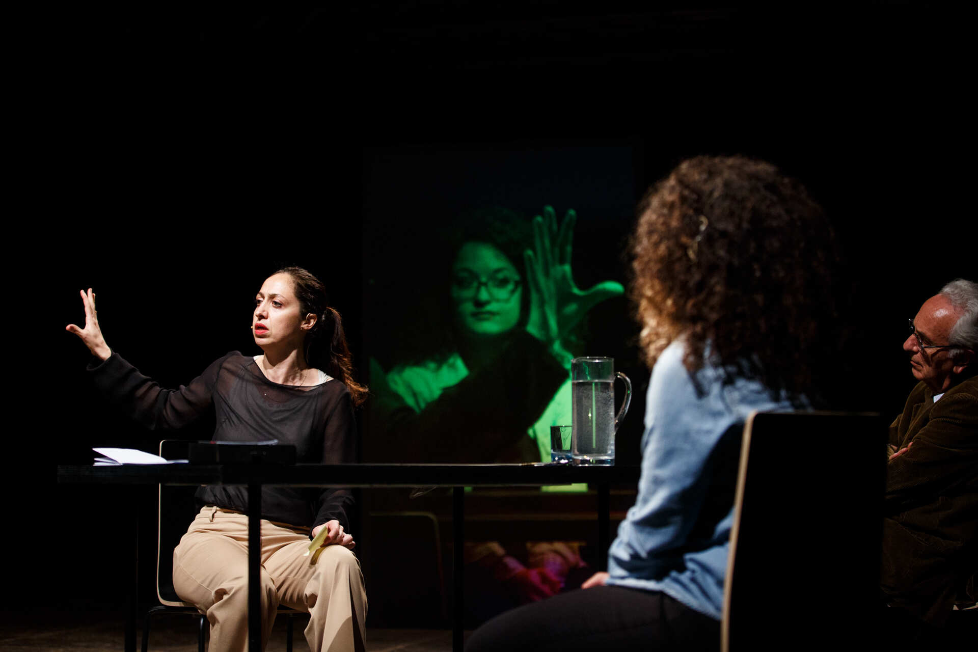 Gaia Saitta choisit, parmi le public, neuf personnes prêtes à l’accompagner dans la reconstitution de l’histoire. Elle distribue les rôles et les invite à partager la scène avec elle et les installe chacun·e sur une chaise, à la place prévue pour le rôle qu’ils vont interpréter. Au fil du spectacle, les participant·es sont interpellé·es et filmé·es.
