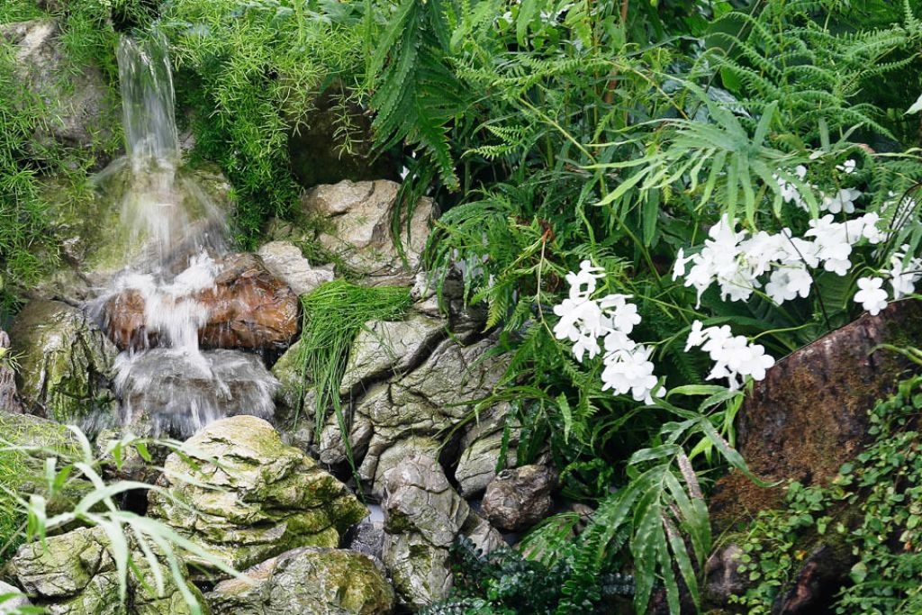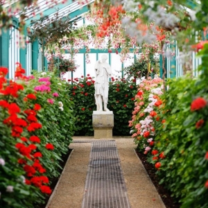 La promenade, pour la première fois aussi en extérieur, permettra aux visiteurs de découvrir des éléments architecturaux qui ornent les jardins, tels que les ruines d'un temple au bord d'un des étangs, la roseraie en arc de cercle et l'atelier de la reine Élisabeth.