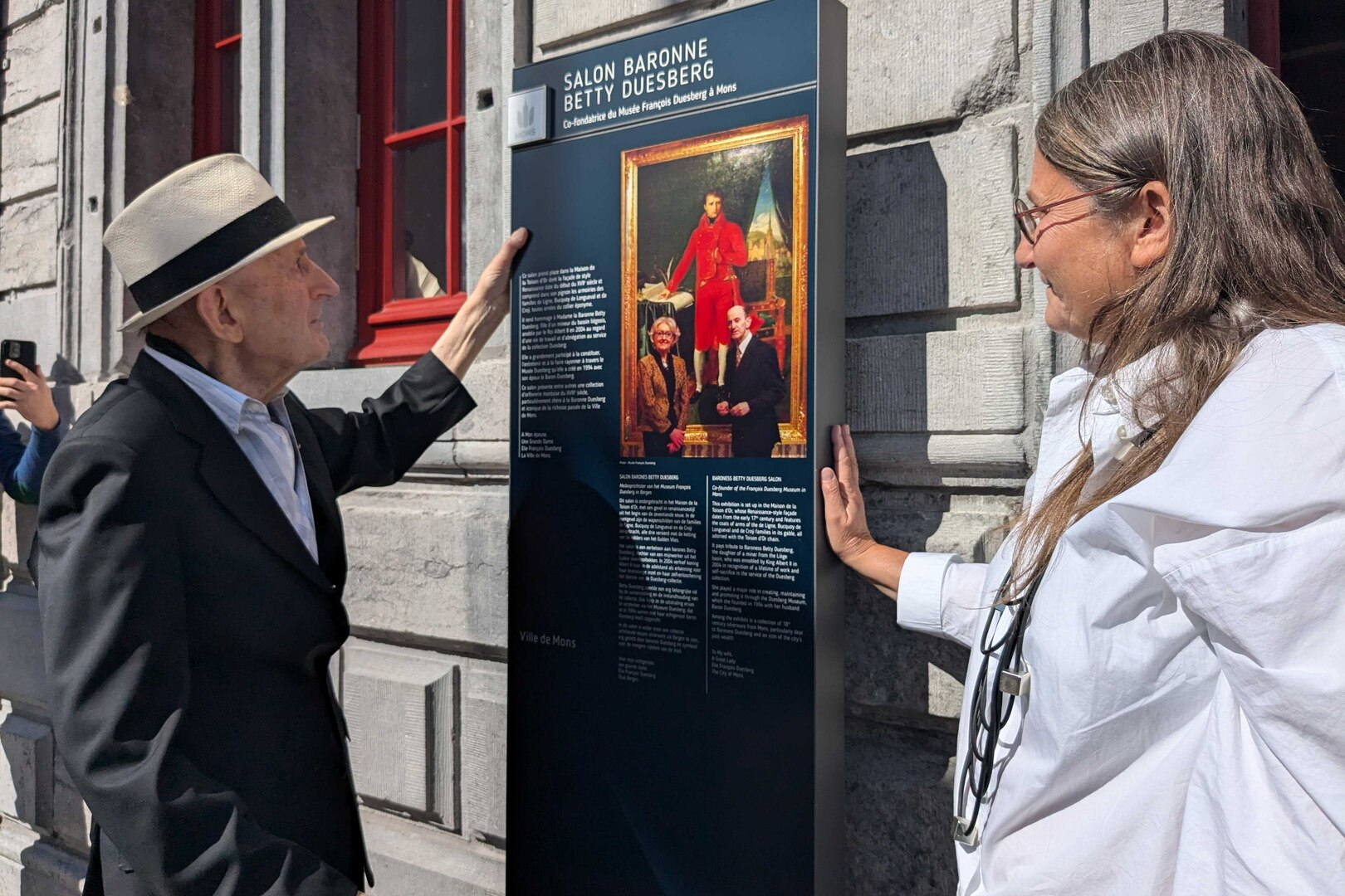 Arrivant, sous les applaudissements, devant la façade du « Salon Betty Duesberg », le baron Elie-François Duisberg fut invité à dévoiler, lui-même, la plaque commémorative, dédiée à son épouse, posée sur la façade de la « Maison de la Toison d’Or », ainsi nommée vu la présence, sur cette même façade, de trois blasons décorés de la « Toison d’0r », ceux des familles Bucquoy de Longueval, de Ligne et de Croÿ.