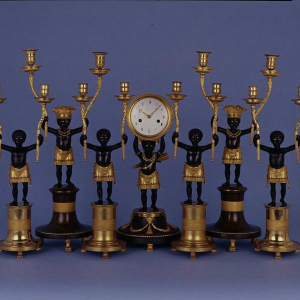 Le mot « nègre » n’étant pas bien accepté, au XXIè siècle, notons que, au XVIIIè siècle, « les pendules décoratives les plus convoitées étaient dites ‘au nègre’, voire ‘au bon sauvage’, Jean François Deverberie (1764-1824), talentueux bronzier, exploitant remarquablement ce thème si prisé de l’exotisme« , ce que précise le catalogue du musée.