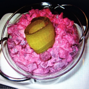 - hacher les oignons et les cornichons égouttés, la pomme, le céleri cuit, la moitié des betteraves, les oignons vinaigrés des harengs;