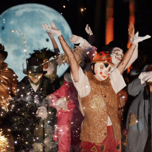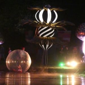 Ainsi, continuant notre balade nocturne, nous nous retrouvons, à deux reprises, devant de petits étangs, apercevant bientôt un petit manège, là où « Pinocchio » voit son nez et ses oreilles pousser, au risque qu’il ne se transforme en âne, alors qu’arrivant au second petit étang, nous voyons « Geppetto » installé dans une barque, voguant sur l’eau, sous une baleine volante, la séquence suivante, en partie circassienne, étant censée se dérouler dans le ventre de cette dernière, comme le veut le récit imaginé par Carlo Collodi.