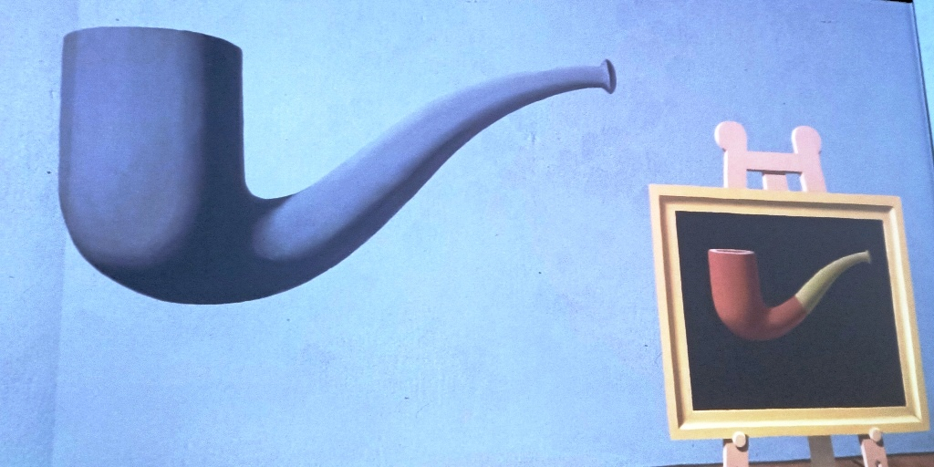 L’artiste belge joue sur les mots comme sur les images, interrogeant notre compréhension de la réalité et de ses représentations. L’une de ses œuvres les plus célèbres, La Trahison des images (1929), représente une pipe associée à l’injonction contradictoire « Ceci n’est pas une pipe ». Ce que nous désignons comme réel, est-ce bien ce que nous percevons ?