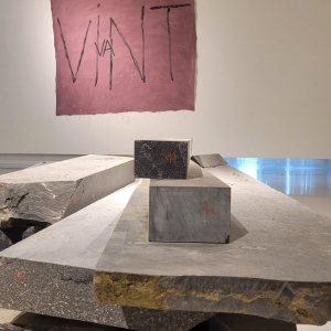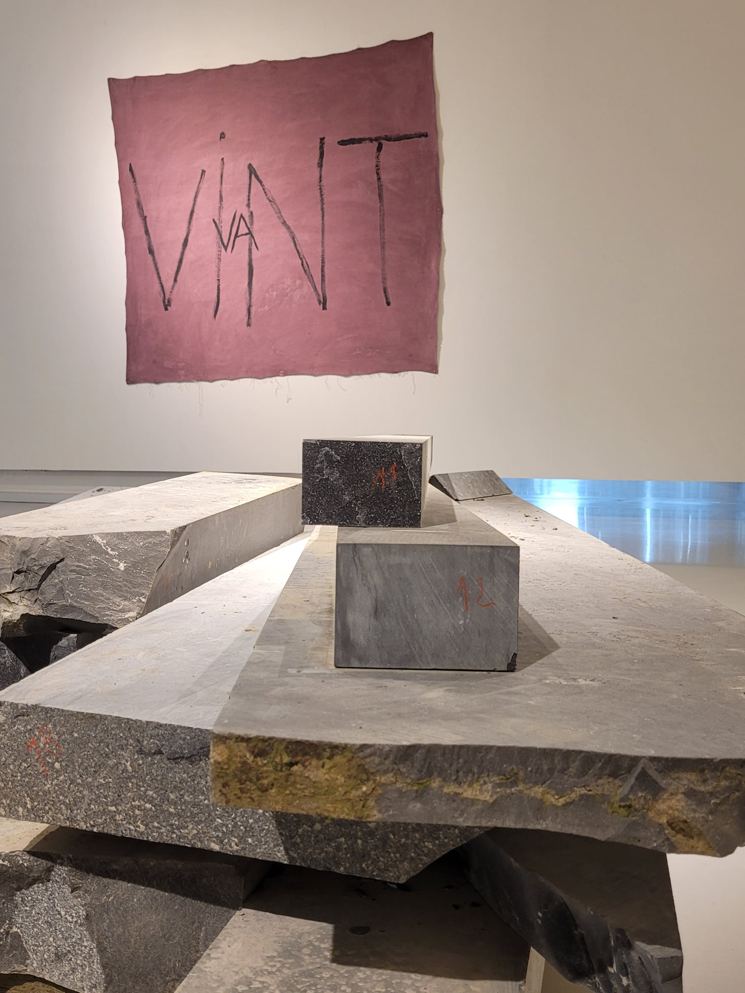 Un jeu double se construit : une référence aux formations géologiques portant des fossiles incrustés d’autres cycles de vie disparus et un lien au lieu ; les carrières voisines.