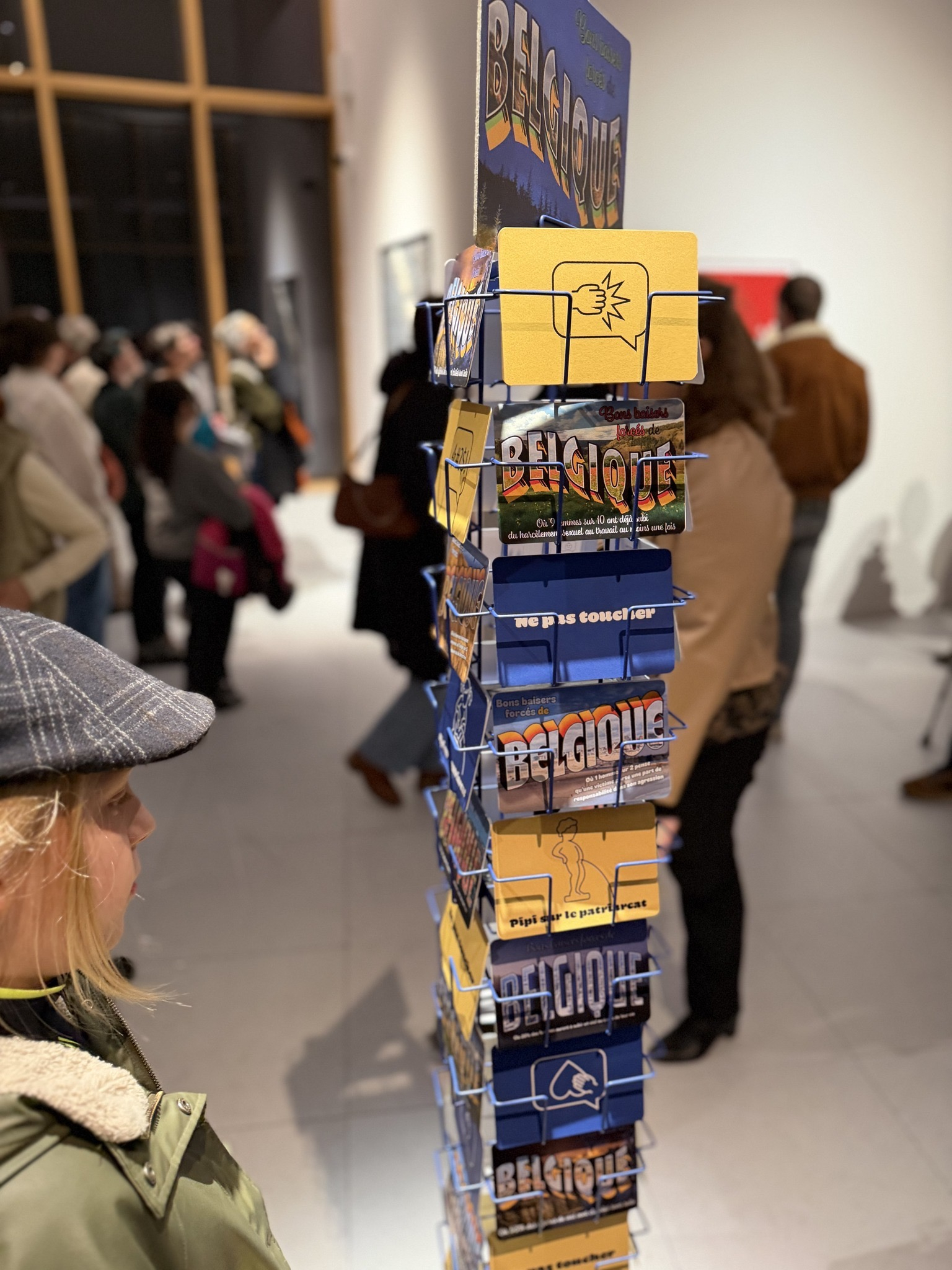 Entre autres, l’artiste plasticien namurois Xavier Mossoux, qui nous propose une installation détournant des objets familiers, les cartes postales, présentées sur un tourniquet, dont le mouvement lent et rotatif évoque la répétition des violences faites aux femmes, leur banalisation quotidienne, la lenteur des procédures et ce sentiment de tourner en rond face à ce qui ne change pas.