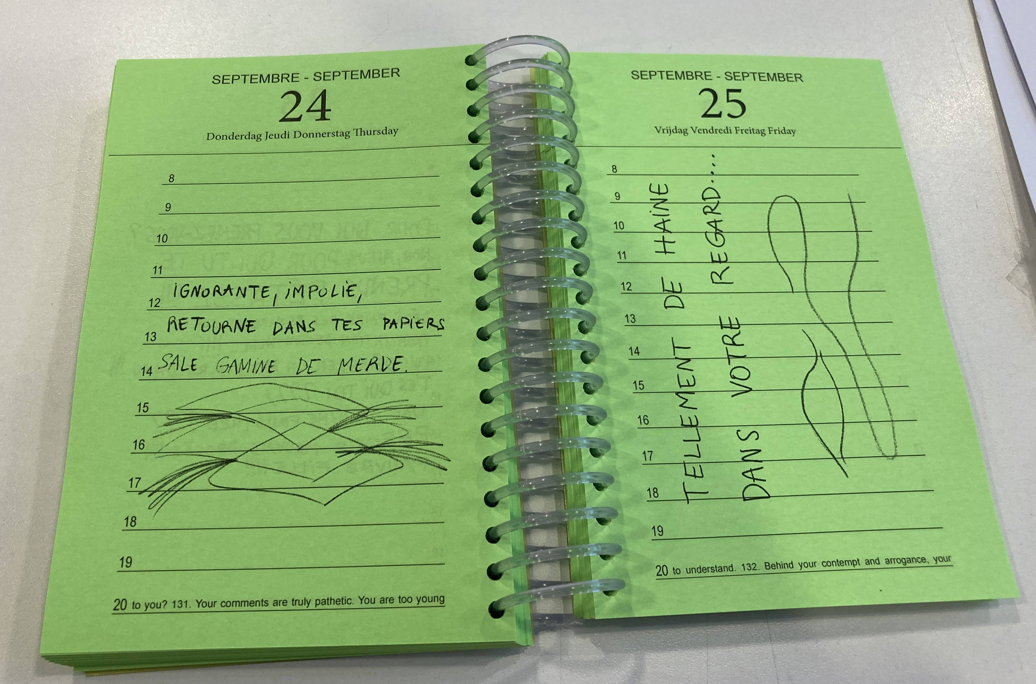 Pour assimiler et présenter ces messages, Sandrine Morgante a choisi cet objet ordinaire qu’est un bête agenda, pour évoquer la banalité de la violence verbale envers les femmes. Dispersés, au fils des jours, les propos moralisateurs, moqueries et violentes agressions nous sautent à la vue. Ils rappellent que la vie d’une femme est semée d’embûches écrites à l’avance. « Il n’empêche, il reste des espaces libres où l’on peut riposter et réécrire notre condition« , écrit-elle.