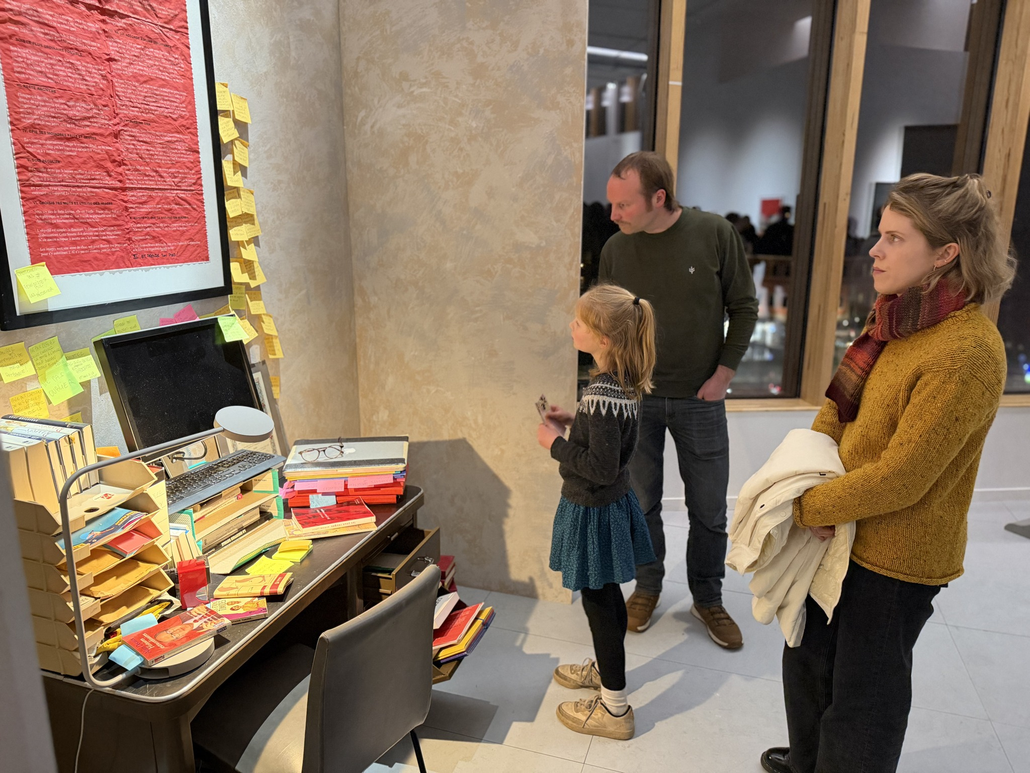 Les autres artistes – Clémence Didion, Romain Garcin, Stephan Goldrajch, Flora Hubot, Justin Lalieux, Maurine Larche, Garance Mor, Lucie Poumay, Pauline Reyre, Loïs Soleil & Serge Van Kerck, ainsi que les designeuses du livre, Jeanne Champenois-Masset, Roxane Daguet, Angeline Guzman, Sarah Juin, Lola Roy-Cassayre, Tanz & Dunya Savilova – interprètent ces messages à travers la bande-dessinée, la broderie, la peinture, la poésie, la reliure, la sculpture, …, ces œuvres conversant pour faire éclore une exposition poignante, qui fait l’effet d’un exutoire face au désœuvrement moral, qui transpire de ces messages.