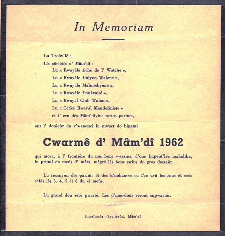 Si la fête n’a pas l’ampleur à laquelle on devait s’attendre, fête il y a. On voit déambuler de petits groupes de costumés le dimanche 4 mars dans les rues de Malmedy, plus pour célébrer la disparition du carnaval que la fin de l’hiver. Les quelques résistants font montre de la satirique souvent rencontrée durant cette période : un pseudo avis mortuaire au Cwarmê d’Mam’dî, des personnes déguisées en médecins vaccinant les passants, des malades du virus et surtout la pose d’une haguète terrassée avec à ses pieds une couronne de fleurs et un drapeau français brodé « Beaune » en berne1. Ici, comme à Eupen et La Calamine, c’est surtout dans les bars que les gens s’attroupent pour les réjouissances sans craindre une sanction.