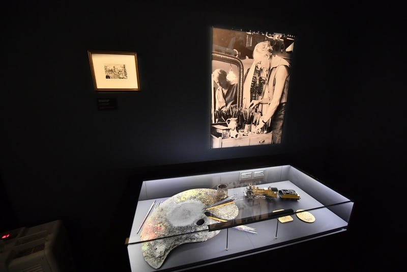Afin de mieux appréhender, l’évolution styllistique de ce peintre, il convient de commencer notre visite par une petite salle, au 1er étage de l’ ancienne salle des pas perdus (asccenseur disponible pour les PMR). En outre nous y découvririns l’une de ses authentiques palettes de peintre et son képi, la « SNCB », en 1984, lui ayant attribué le titre de « chef de gare d’honneur », pour Louvain-la-Neuve.
