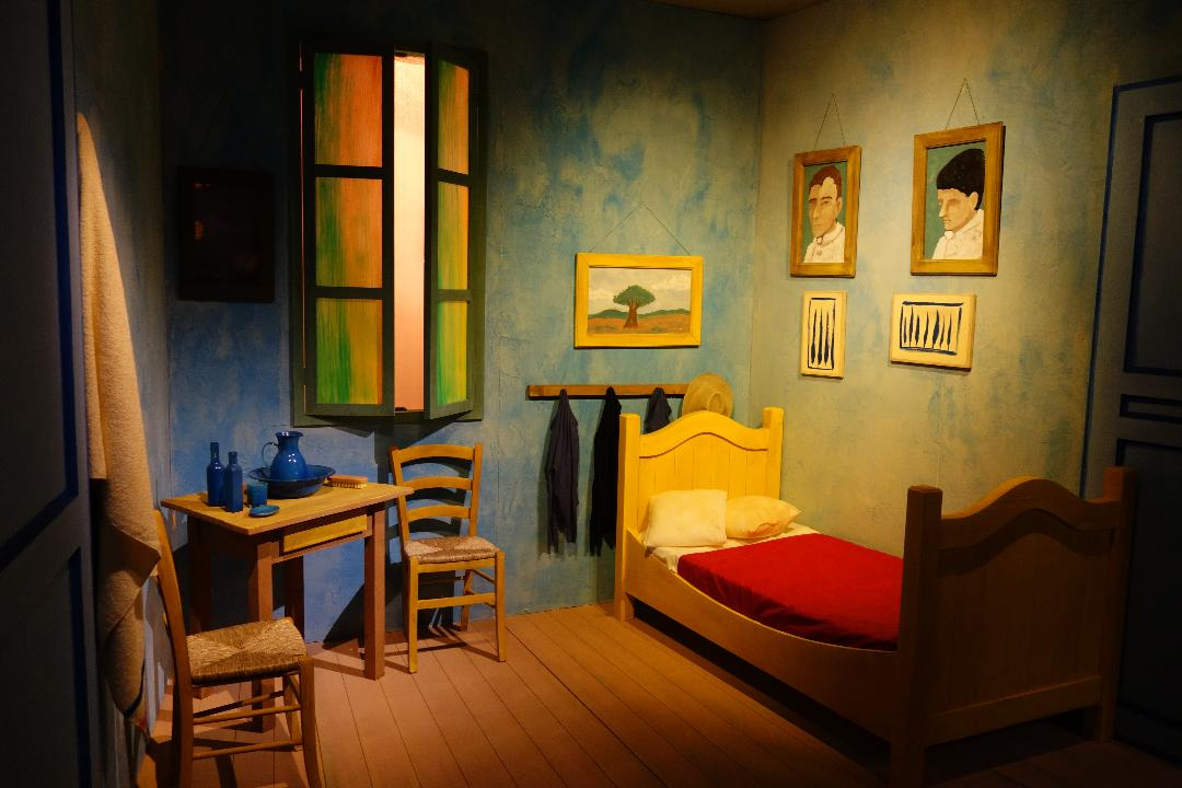 Au départ, différents panneaux nous dévoilent la vie de Van Gogh, alors que de nombreuses copies de ses tableaux sont exposées, dont une série consacrée à ses célèbres tournesols.