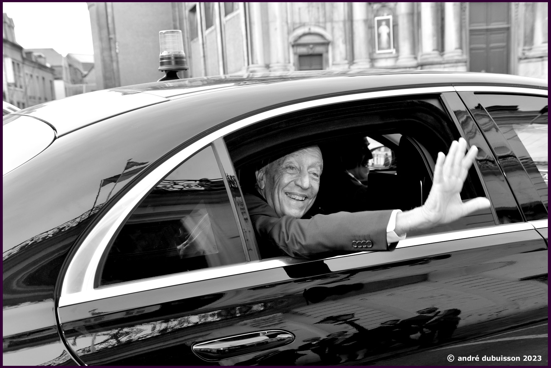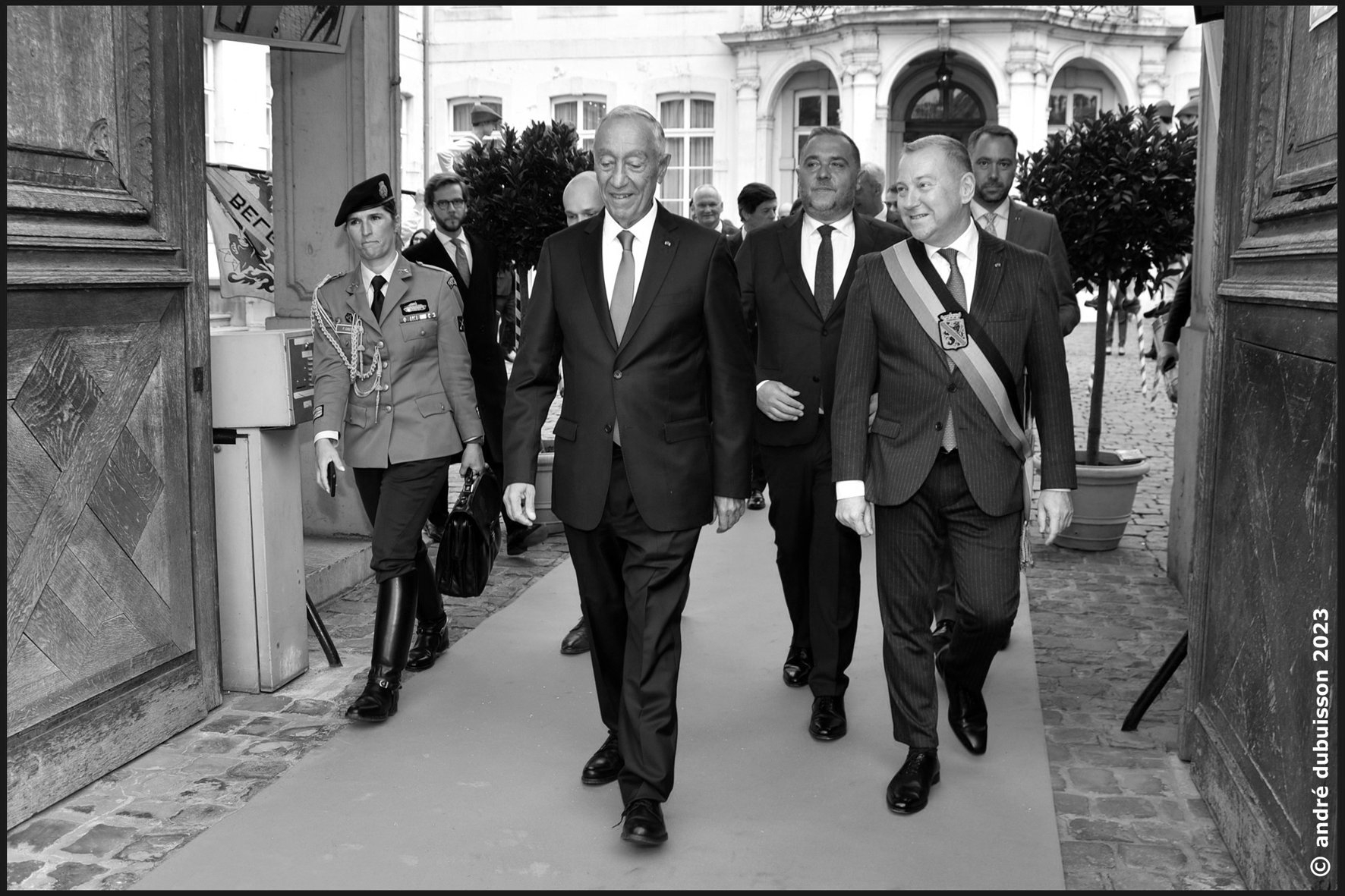 Alors que sa voiture l’attendait à la sortie de l’UNamur, il décida de se rendre à pied vers le Palais provincial, une trentaine de motards le suivant, précédant sa voiture. Saluant au passage des adolescent.e.s de la section Lycée de l’Athénée royal, ainsi qu’un papa, portant son petit enfant dans ses bras, il arriva dans la cour d’honneur du Palais provincial, où la délégation portugaise fut accueillie, au son de leurs fifres et tambours, par une trentaine de membres (gendarmes, grenadiers, sapeurs, voltigeurs, zouaves, …) d’une « Marche de l’Entre Sambre et Meuse », celle de « Notre-Dame de Walcourt ».
