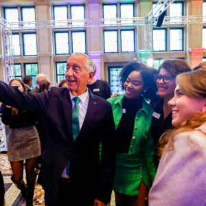 Empruntant le tapis rouge, le Président alla, en toute convivialité, à la rencontre d'une vingtaine d'étudiant.e.s portugais.e.s, du programme "Erasmus" et belges, Acceptant qu'une étudiante le photographie avec elle, en "selfie". Ayant pris le temps de s'entretenir quelque peu avec tous.tes les étudiant.e.s, il revint sur ses pas, utilisant son propre smartphone pour réaliser, avec une extrême amabilité, un "selfie" personnel avec chaque étudiant.e