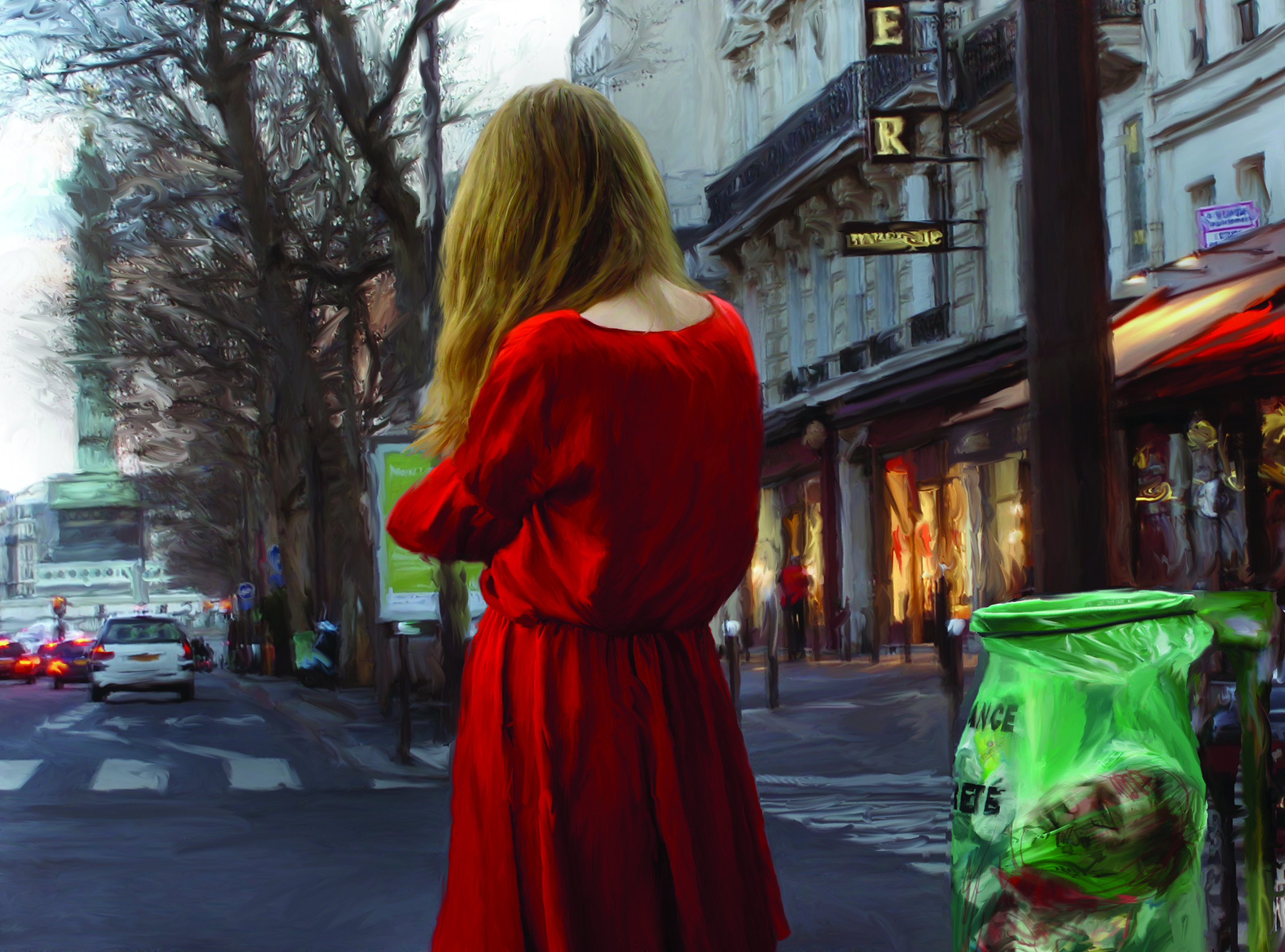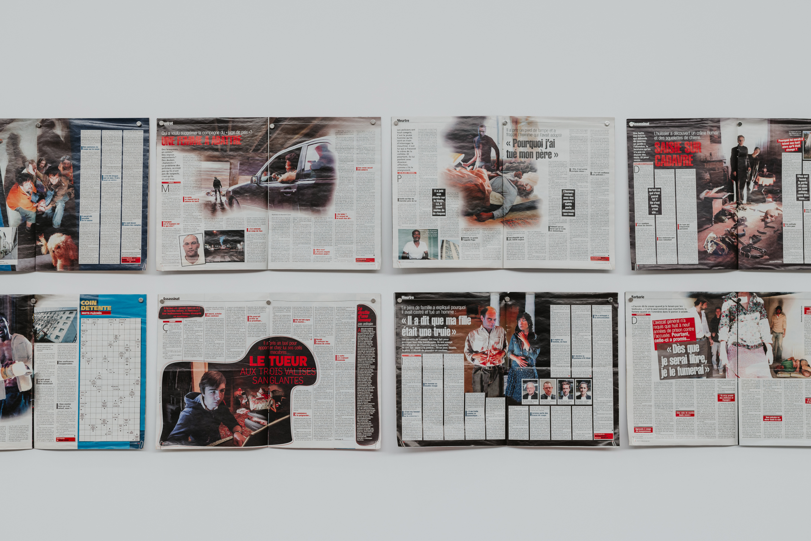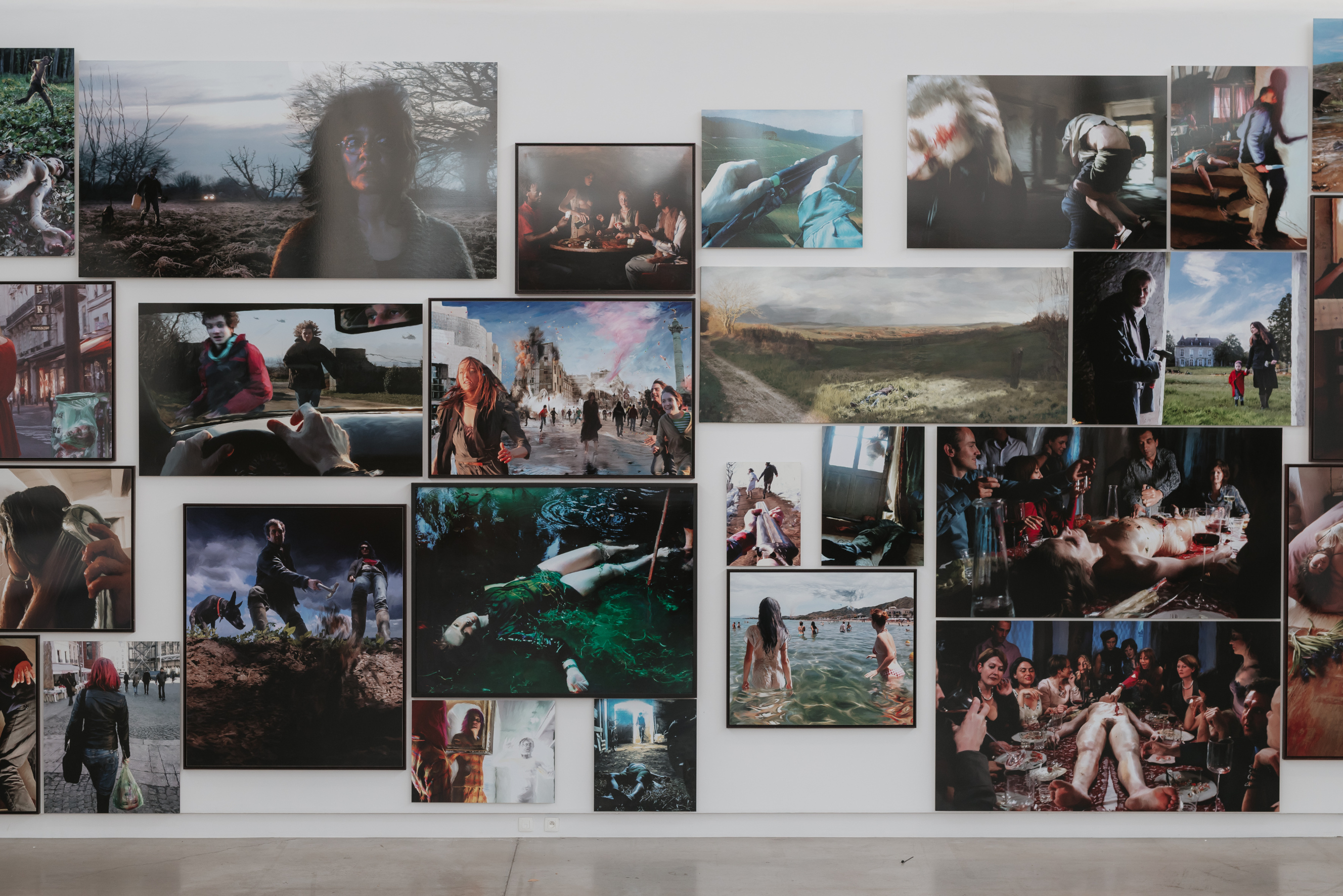 La Grande Halle du BPS22 est plongée dans une pénombre bleutée. Une longue table de banquet semble témoigner d’une fête interrompue. Gâteaux, volailles et gibiers, bouteilles de vin, coupes de fruits et bouquets fauchés s’étalent comme une orgie figée : chairs vernissées, reliefs monstrueux, appétits hypertrophiés dont le grotesque domestique pointe la vacuité et la petitesse des désirs consuméristes. La matière semble vouloir reprendre vie, prête à rejouer la farce d’un festin impossible. À l’opposé, un mur saturé de plus de 70 tableaux-photographiques offre une toute autre profusion : celle des faits divers dont la violence n’apparaît jamais frontalement mais surgit dans un détail déplacé, une présence incongrue, une atmosphère trop bien éclairée pour être innocente, un décor propret où affleure l’inquiétude, un geste suspendu qui appelle une histoire.