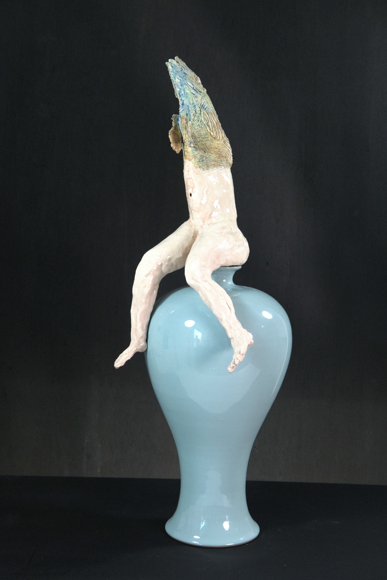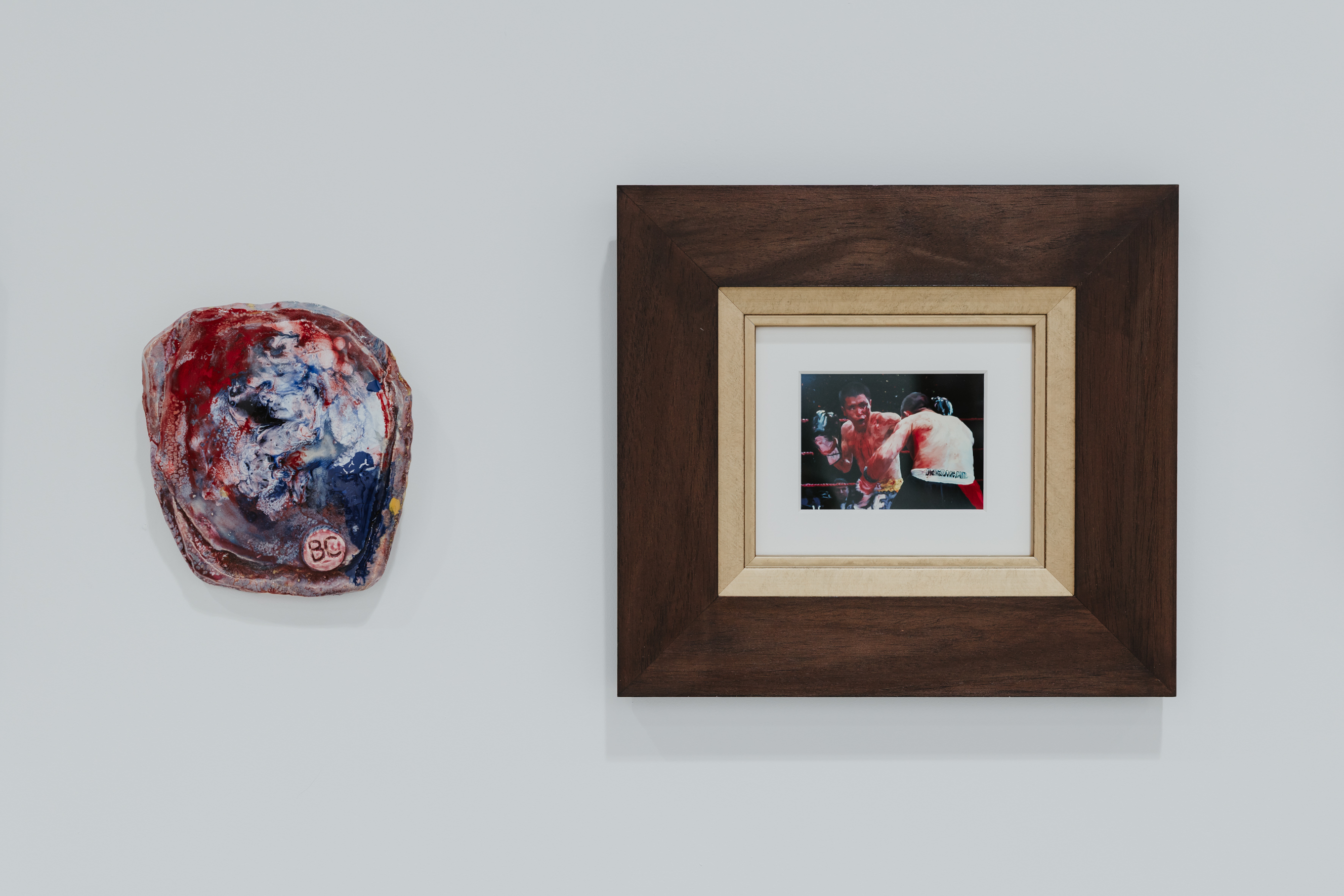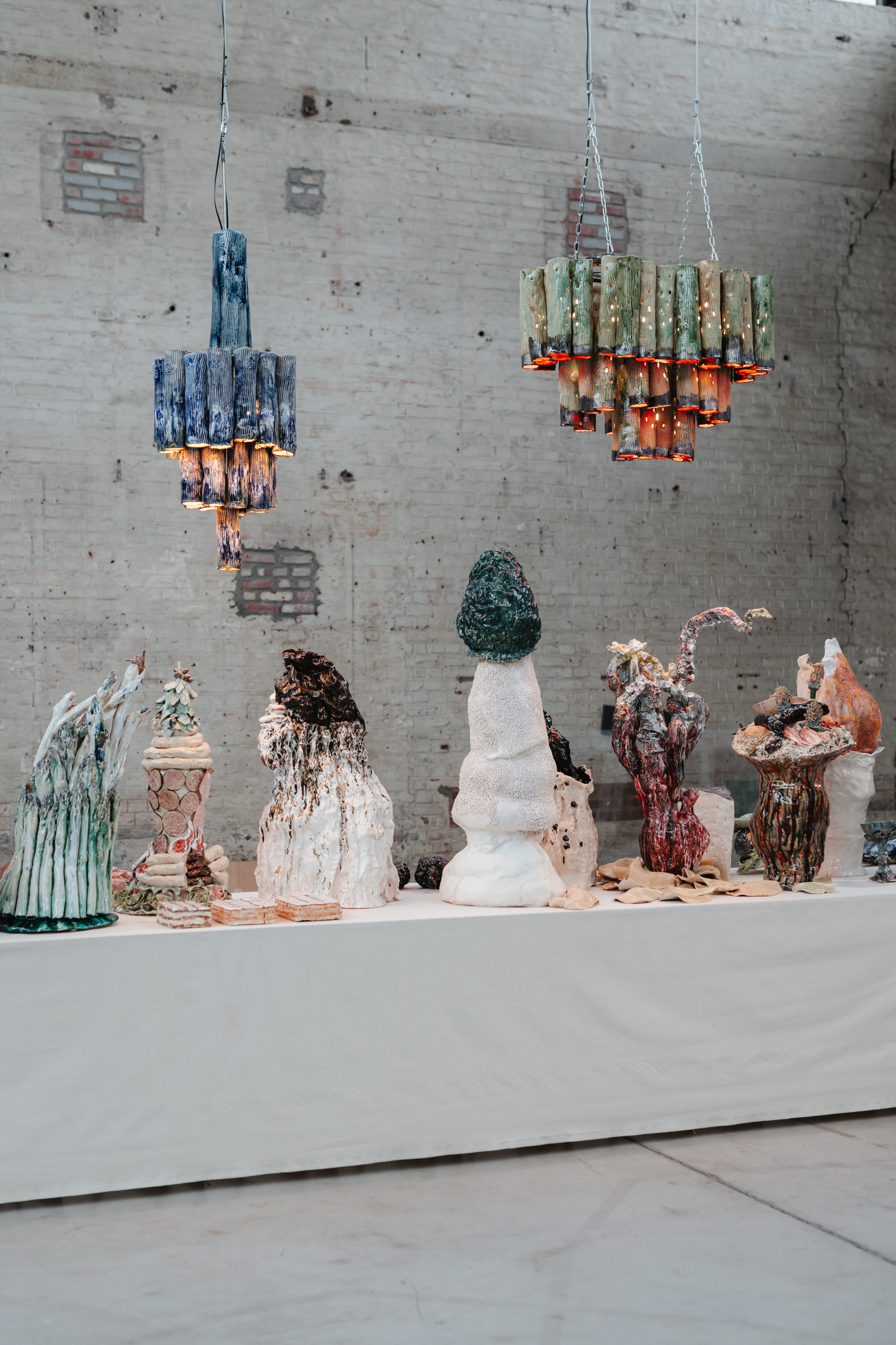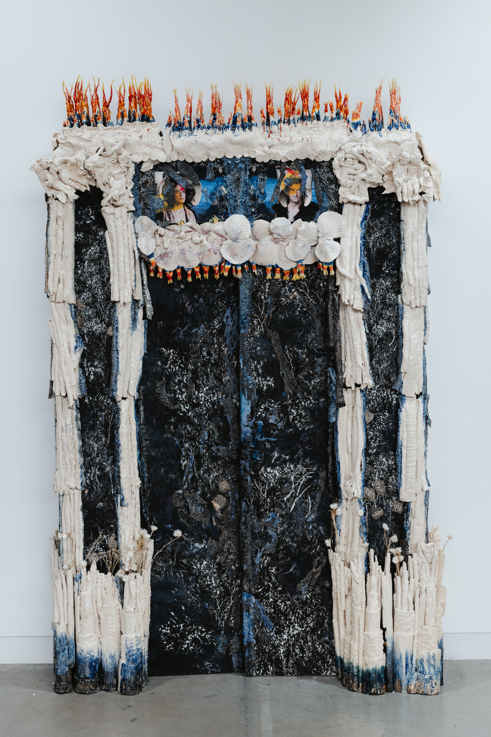 complexe. Face à cette mise en scène mêlant mythes fondateurs et renaissance, le banquet de céramiques se présente comme l’incarnation tangible de cette transformation. Chaque pièce, chairs d’émail et formes grotesques, devient symbole d’une incarnation désordonnée, presque baroque, de la pulsion créatrice. Par contraste, le mur de tableaux-photographiques archive des fragments du réel - les faits divers - comme autant de micro-mythologies populaires figées dans le temps.
