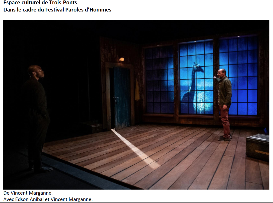 • Mercredi 09/02 à 20h  THÉÂTRE  Muzungu  Espace culturel de Trois-Ponts   Dans le cadre du Festival Paroles d’Hommes  De Vincent Marganne.  Avec Edson Anibal et Vincent Marganne.