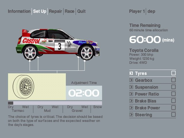 9. Un petit côté réaliste, certes partagé par d'autres jeux. Ainsi, voici un petit conseil pour la route (tant en mode championnat qu'en mode rallye unique) : bien lire les informations car le temps est variable, ceci afin de vous permettre de changer les pneus en conséquence, les réparations toutes les deux étapes sont vitales (à vous de bien gérer les priorités).