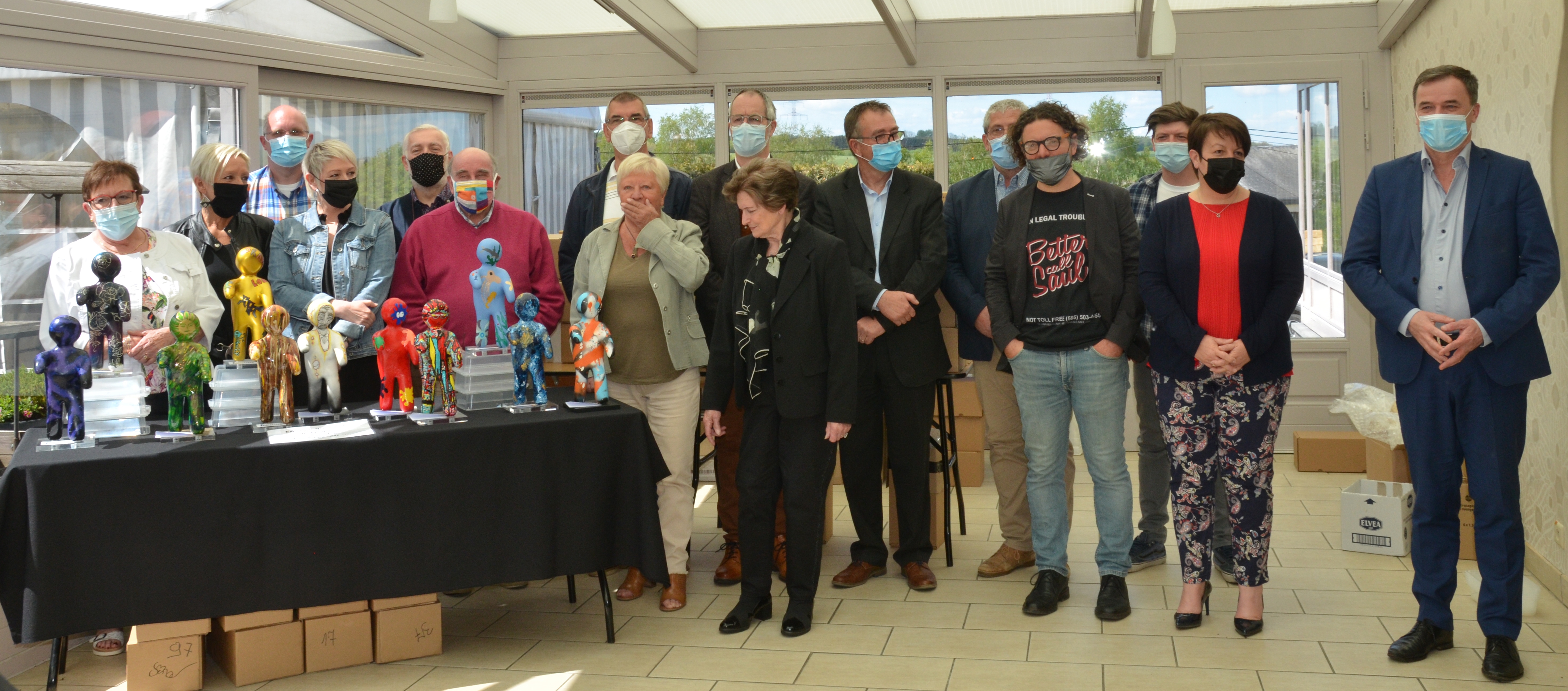 En contactant les écoles secondaires de Bastogne qui organisent des sections artistiques et où notre projet rencontra très vite adhésion et enthousiasme, en l’ occurence l’ Athénée Royal et de l’ INDSE, nous savions que nous visions juste. Les professeurs Mr Dehossay pour l’ Athénée et Madame Farmir pour l’ INDSE ont parfaitement géré la situation. En donnant ainsi l’ opportunité à ces jeunes artistes locaux en herbe de s’ exprimer ,ils leurs ont permis de nous transmettre, et de bien belle manière le fruit de leur réflexion et la démonstration de leur talent en devenir. Le travail est remarquable.Toutes leurs poupées ont d’ ailleurs été vendues. Comme il était impossible de les inviter aujourd’hui( la jauge de 50 personnes) nous les rencontrerons tous personnellement mardi prochain en classe dans leur école pour les féliciter et les remercier. Ce matin, c’est aux représentants de ces écoles, Mr Dominique LAMBERT sous directeur à l’ indse et Madame Anne Françoise Pagani, coordinatrice du Cefa Nord Luxembourg et Monsieur Dehossay Thomas professeur d’ art à l’ Athénée Royal que nous témoignons toute notre gratitude Bravo à vous, à vos écoles et toujours avec autant de plaisir, nous vous remettons également un petit présent. Merci