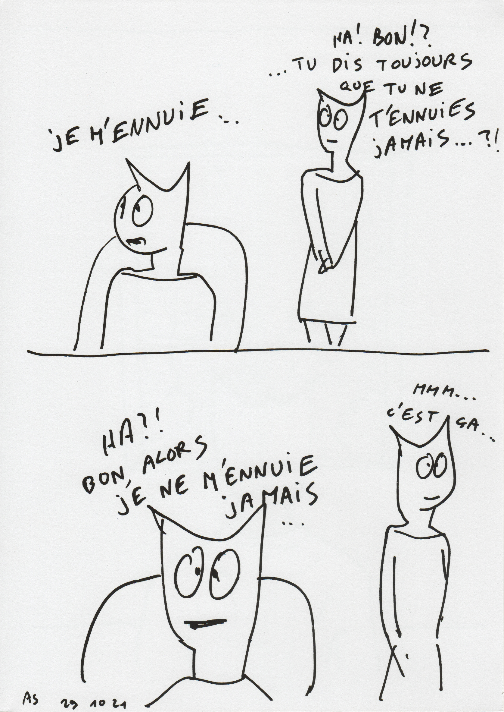 Le BPS22 organise la première grande exposition muséale, en Belgique, de l’artiste français Alain Séchas (Colombes, 1955). Bien qu’il ne s’agisse pas à proprement parler d’une rétrospective, Je ne m'ennuie jamais... rassemble plus de 200 œuvres emblématiques des différentes périodes de l’artiste, allant des premières sculptures de chat qui ont fait sa célébrité à ses toutes récentes peintures, sans oublier les installations animées, la vidéo ou les affiches, avec un fil conducteur : le dessin.