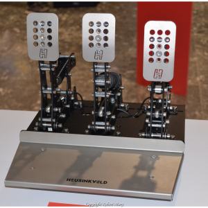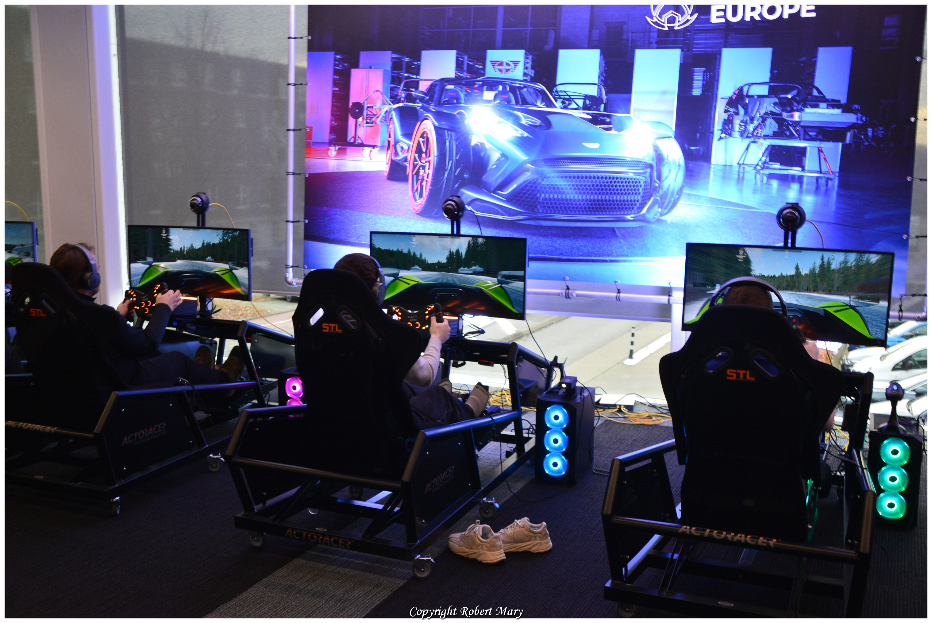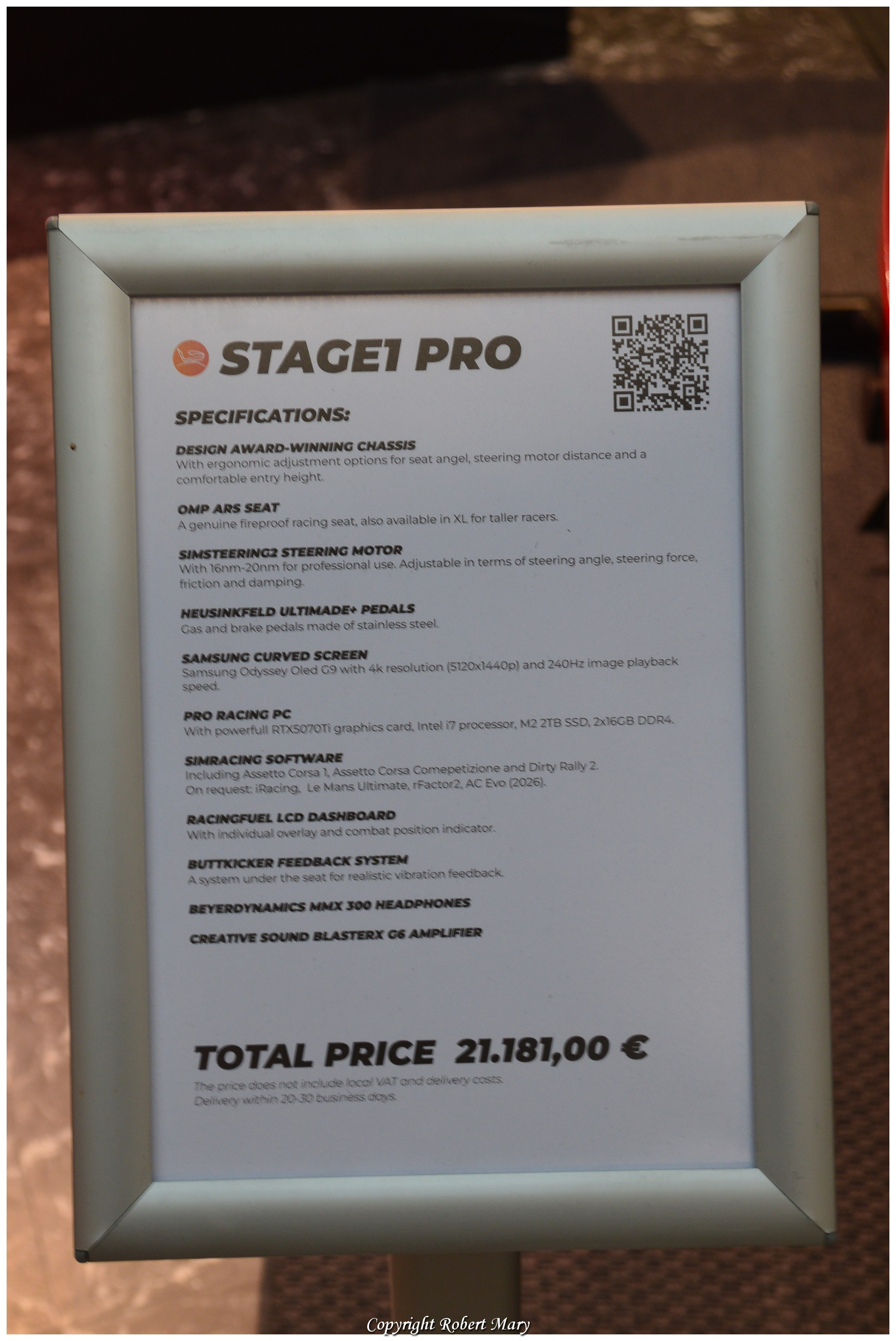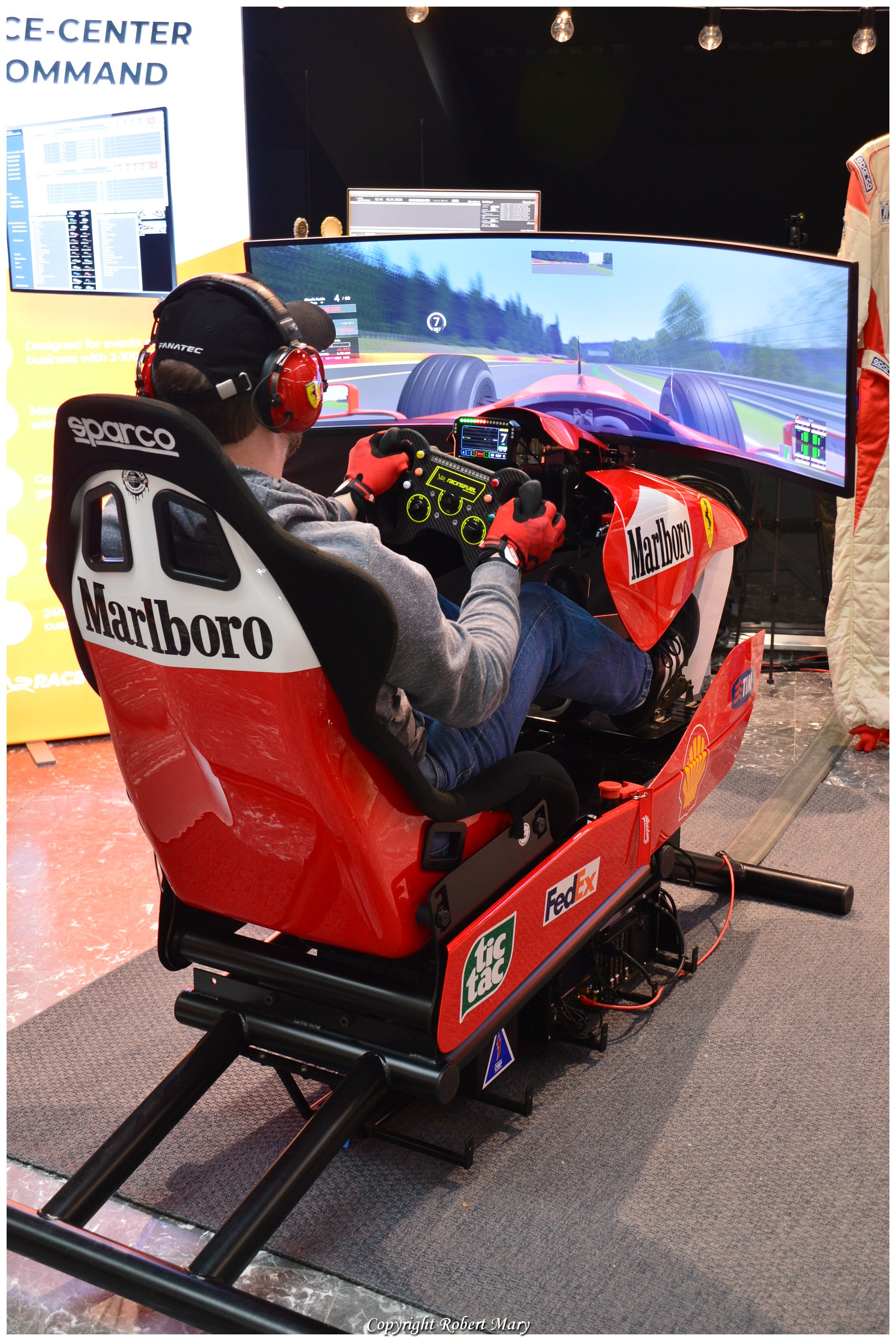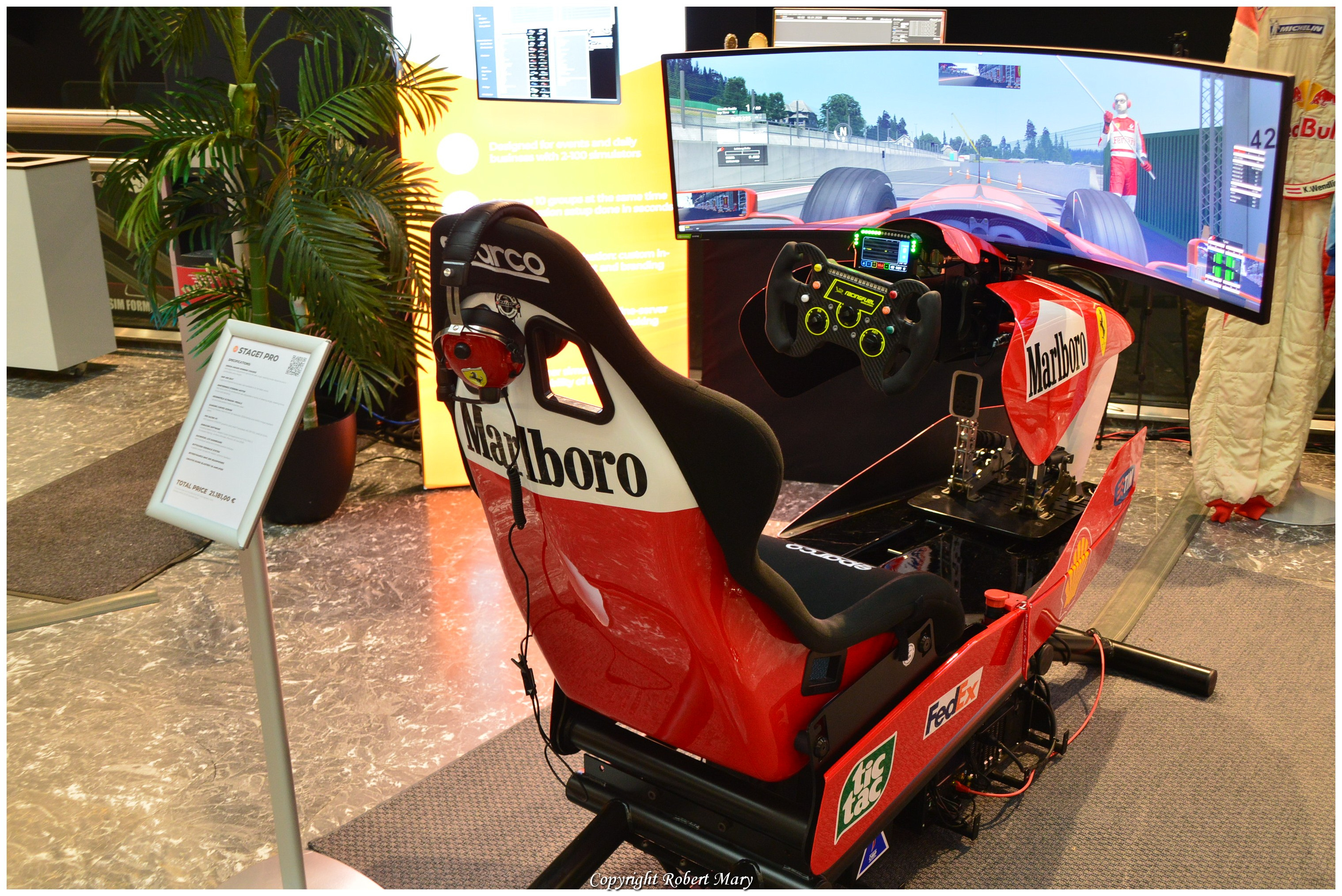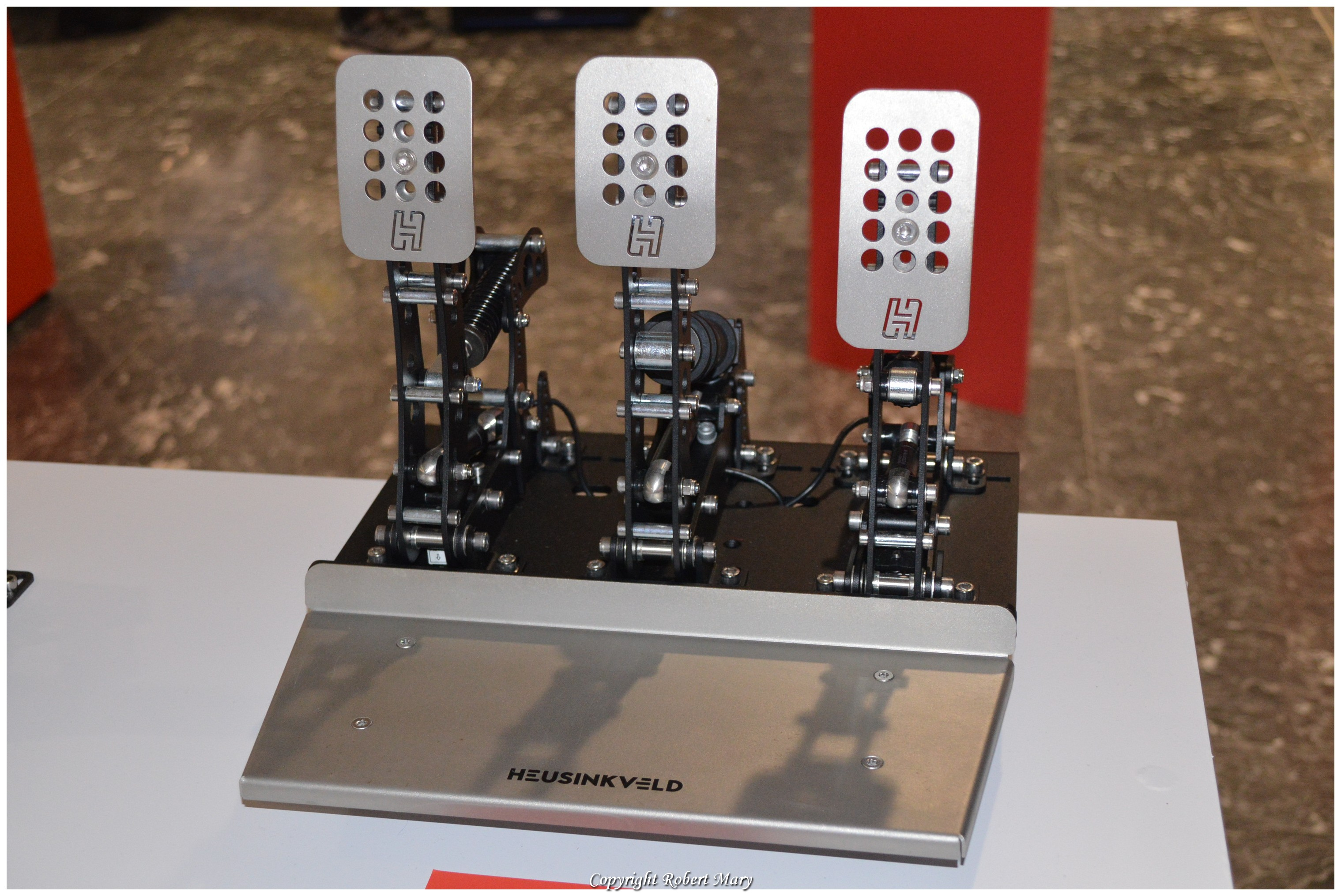 Pour les simulateurs j'ai testé pour vous celui de Sparco avec livrée Ferrari de Schumacher. Le retour de force est trop important pour moi mais c'est personnel. Je testais Assetto Corsa. Je trouve le prix onéreux (21.200 €) surtout pour un simulateur qui n'offre même pas le support dynamique sur vérins permettant les mouvements du socle. A titre de comparaison, avec un PC comparable doté de la même carte graphique, le même écran Samsung G9, un ensemble Logitech G920 monté sur "gaming rig" Next Level racing (ensemble de fixation métalique avec roulettes), on arrive à moins de 4.000 €. On me dit que le prix est justifié par le châssis rougé détaillé devant le siège... Ceci dit, l'expérience est immersive. J'ai eu la bonne surprise de tester les pédales Heusinkveld (marque néerlandaise, sa présence n'est donc pas un hasard au salon) qui sont compatibles avec un volant G29 ou G920 de Logitech (à condition de brancher le câble USB des pédales au PC), remplaçant de ce fait les pédales originales plus "bas de gamme". Ceci vous permet d'avoir un volant compatible avec tous les jeux (ce qui n'est pas forcément le cas avec des titres anciens) couplé à des pédales "haut de gamme" (de type "load cell"). Les pédales Heusinkveld Sim Pedals (Sprint, Ultimate+, etc.) sont conçues pour se connecter directement à votre PC via un câble USB dédié à un boîtier contrôleur, et non à la base du G29. Elles fonctionneront alors comme un périphérique d'entrée séparé.
