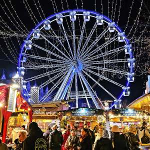 Cette attraction est équipée de 24 panneaux solaires installés sur chaque nacelle, ce qui permet de réduire considérablement sa consommation d’énergie et qui en fait la première grande roue écologique d’Europe ! Les cabines sont fermées, et donc protégées de la pluie et du vent, et aménagées avec une belle tablette, permettant une sympathique dégustation tout en découvrant une superbe vue de la ville, de son Palais des Princes Evêques, de son Hôtel de Ville, et du Village de Noël ! Elle est également équipée en son centre d’un écran lumineux LED qui pourra diffuser en permanence des images du Village de Noël… Avec une belle décoration de Noël très épurée et dans l’esprit de Noël, cette Grande Roue sera avec la Pyramide de Noël une des attractions principales de ce Village de Noël…