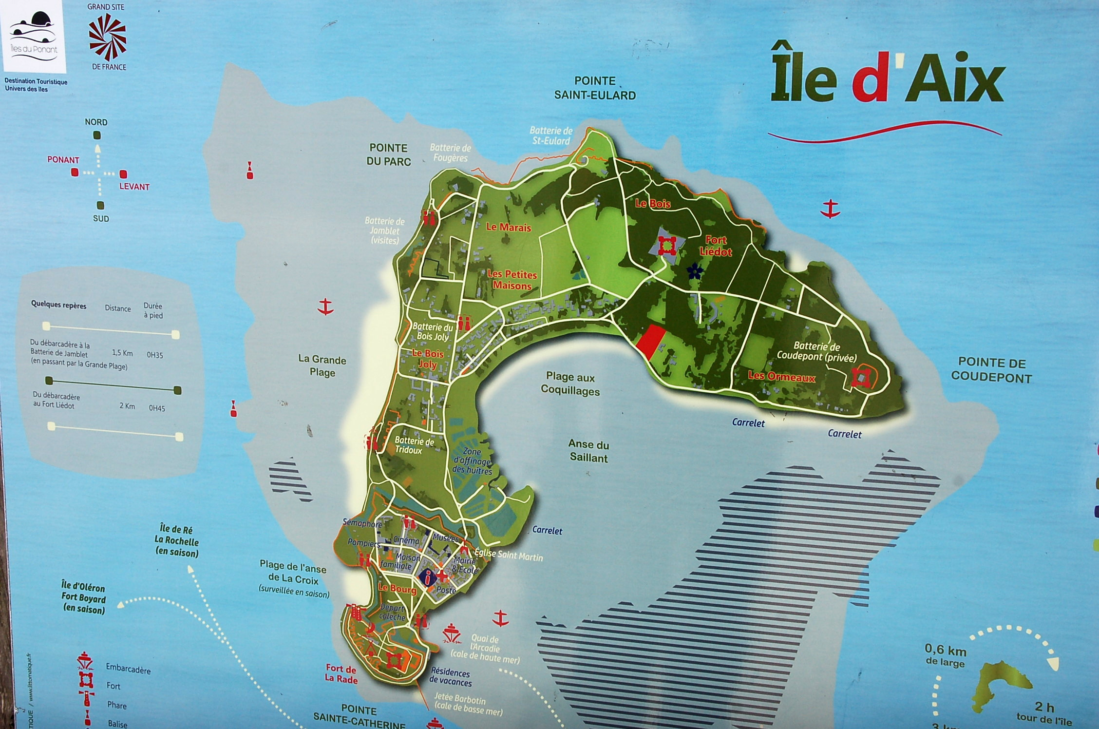 La société inter-îles propose un voyage en bateau (là, le bus n'est pas possible) vers l'île d'Aix où Napoléon a séjourné trois jours avant de se décider à se livrer aux anglais. Vous pourrez y visiter le musée Napoléon et le musée africain. L'île est plus petite, faire le tour de celle-ci à pied est possible d'autant plus que certains chemins sont exclusivement réservés par ce moyen. Le voyage à pied nous a permis de trouver plus facilement le Fort Liedot, un endroit agréable car très frais à l'intérieur lorsqu'il fait 31 degrés à l'extérieur!