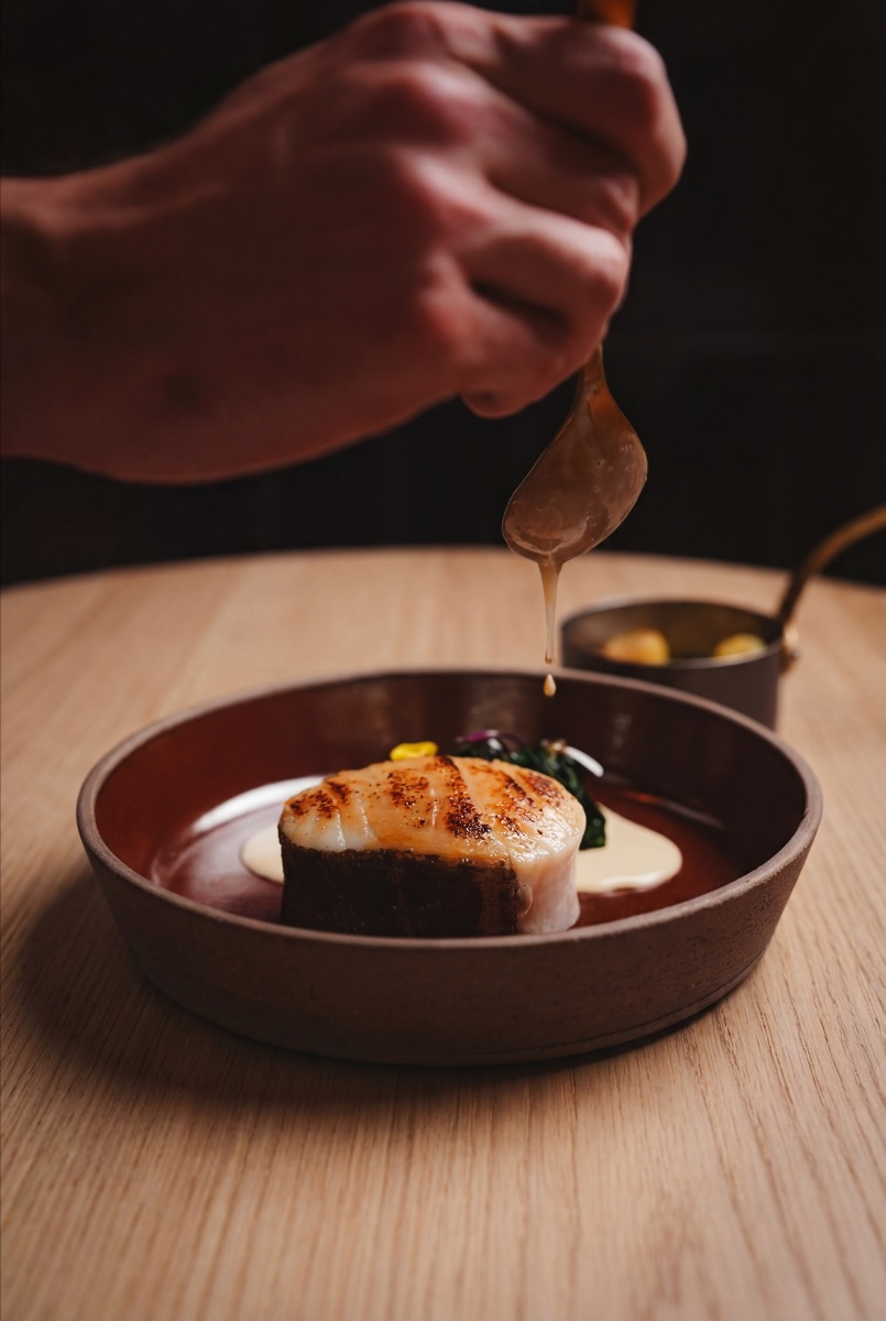 Le pari est délicat entre tradition et multiples influences. Mizaru choisit la voie de l’équilibre  celle des repères familiers tout en les déplaçant légèrement. Un vol-au-vent de coucou de Malines se teinte ainsi de Tom kha kai et de galanga, tandis que les croquettes s’habillent de citron confit, de saké ou de nuances d’Asie. Même les escargots s’offrent une relecture inattendue avec miso blanc et focaccia au sésame noir. Résultat ? Une cuisine lisible et généreuse, mais traversée de nuances nouvelles. Rien n’est démonstratif, tout est dans le détail.