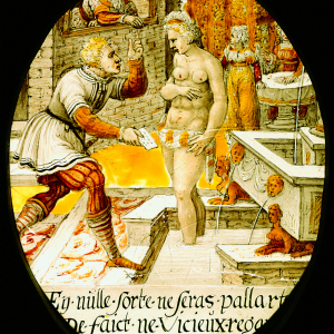 Parmi les nombreuses autres pièces exposées, notons un rondel en verre, représentant « Bethsabée au Bain » (1578), peint à la grisaille, au jaune d’argent et à la sanguine, ce type d’épisode biblique permettant aux artistes de peindre des nus féminins.