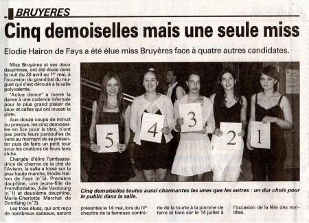 Je suis la Miss de la ville française jumelée avec Vielsalm : Bruyères. Ci-joint les articles de journaux succédant à mon élection le 30 avril 2006, l'élection ayant lieu tout les deux ans car la ville de Bruyères contrairement à celle de Vielsalm n'organise une fête des myrtilles qu'une année sur deux. J'ai participé avec mes dauphines à plusieurs manifestations: la confrérie de la Tourte à la Pomme de Terre l'année dernière et cette année qui a lieu mi mai, la fête des Myrtilles de Bruyères (14 juillet 2006) et celle de Vielsalm l'année dernière et cette année.